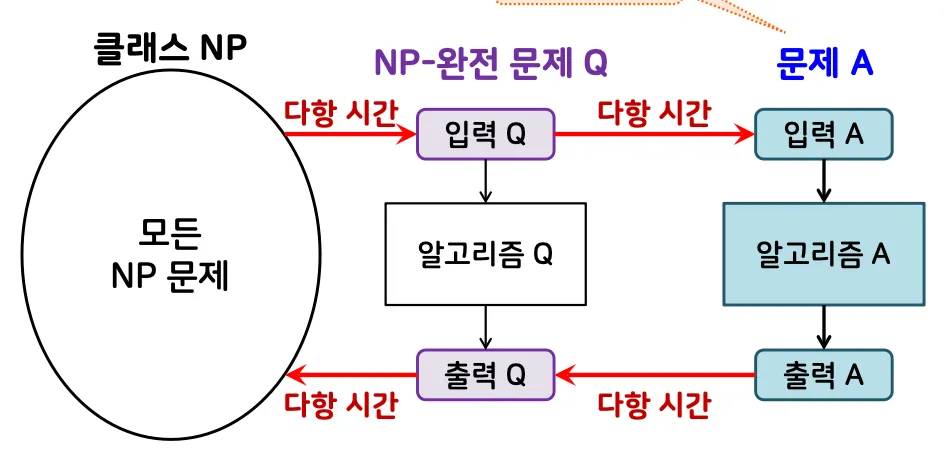 클래스 NP에 속하는 모든 문제가 문제 A로 다항 시간에 변환됨