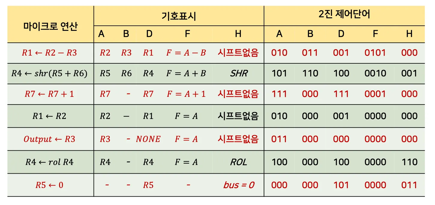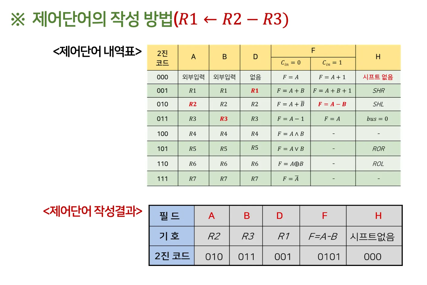 → 전체 16비트로 구성된 선택신호들의 모임(제어단어)을 처리장치의 각 구성요소에 가하면 해당 마이크로 연산이 수행됨