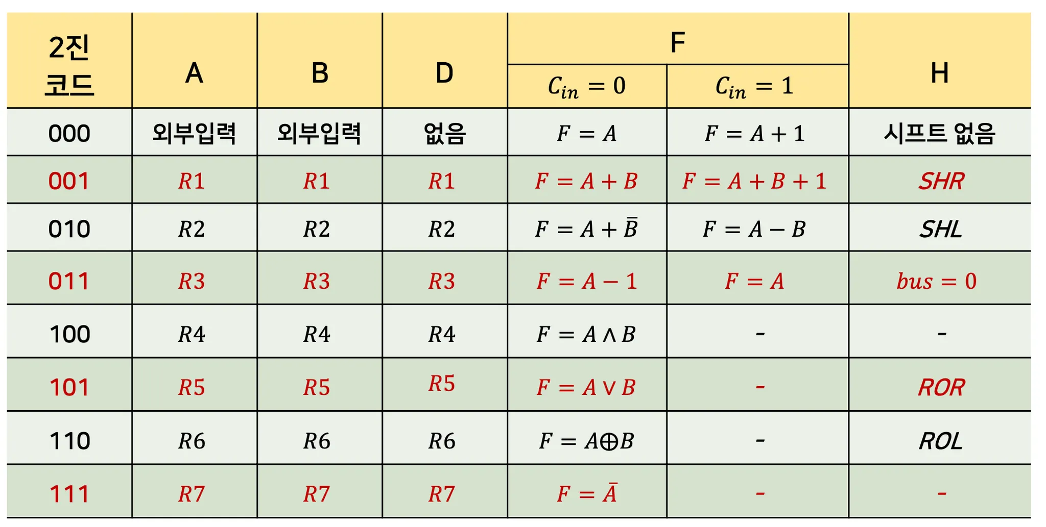 선택신호 F는 ALU에서 산술연산 A+B를 수행