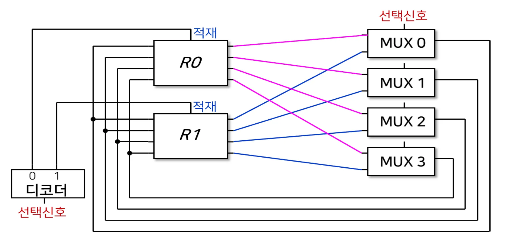 내부버스 구성을 위해 2×1 MUX 4개, 1×2 디코더 1개필요
