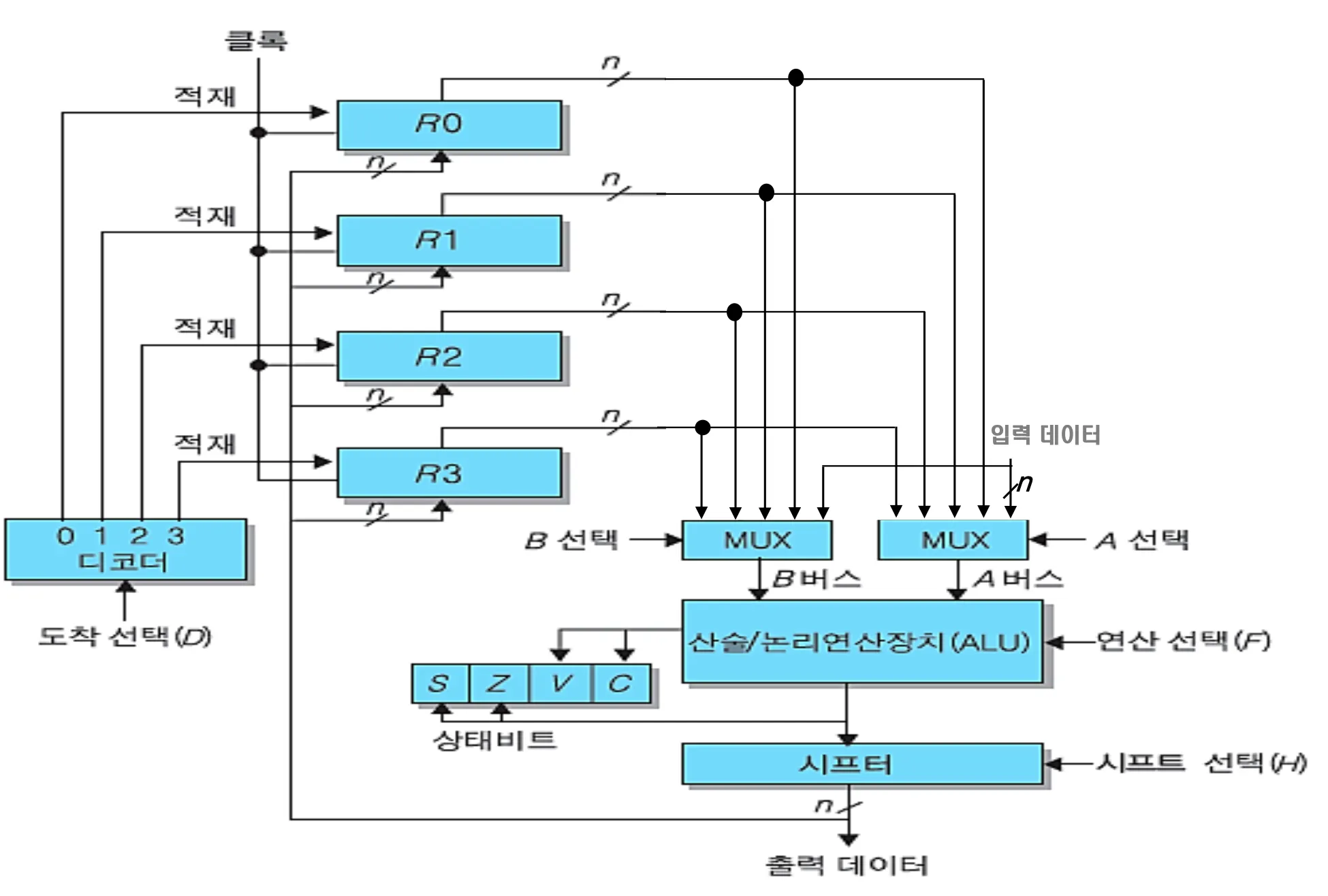 내부 레지스터 (7개)에서 입력데이터가 들어올 수도 있고, 외부 기억장치 (1개)에서도 들아올 수 있음