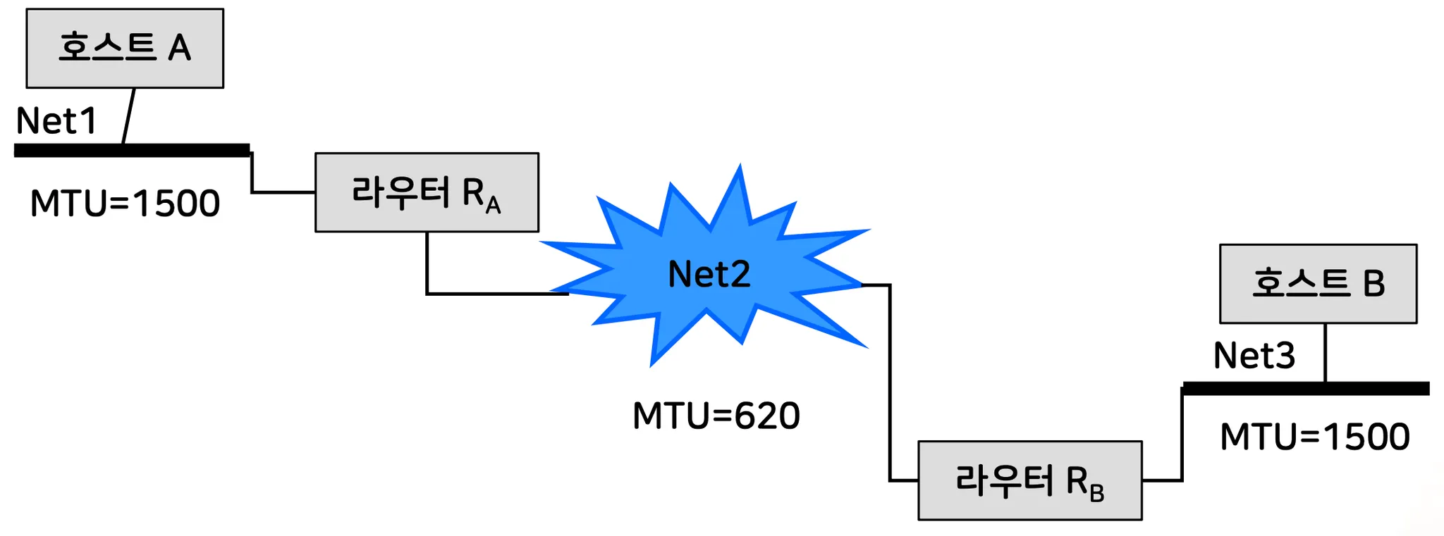 IP 데이터그램은 전송 중 각 네트워크의 MTU에 적합한 크기로 분할되었다가 목적지 호스트에서 각 Fragment들을 재조립함