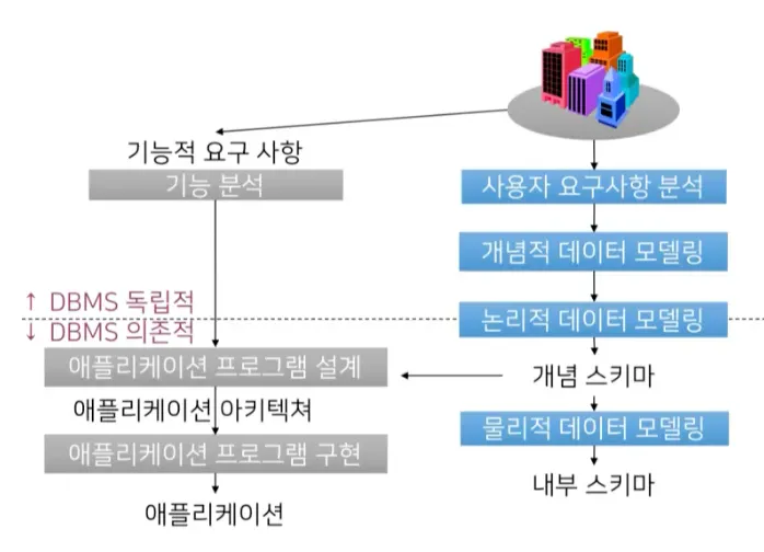 사용자 요구사항 분석 → 개념적 모델링 → 논리적 데이터 모델링 → 물리적 데이터 모델링