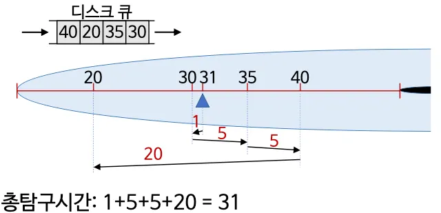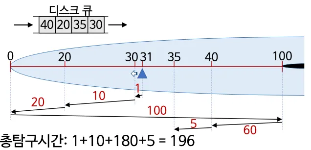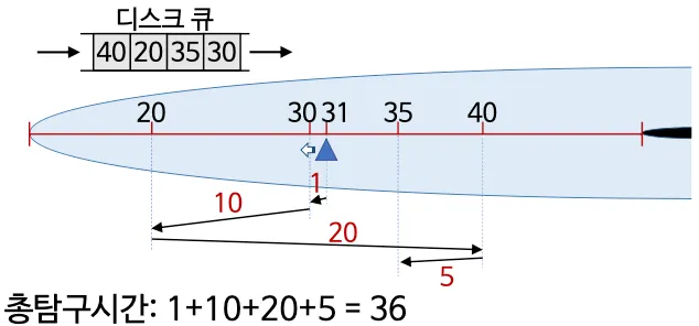 양 끝 트랙 사이를 왕복하면서 진행방향의 가장 가까운 접근 요구를 먼저 처리하는 방법