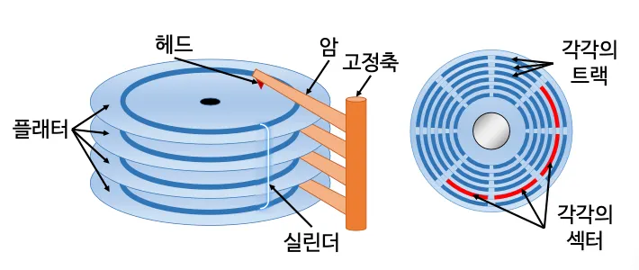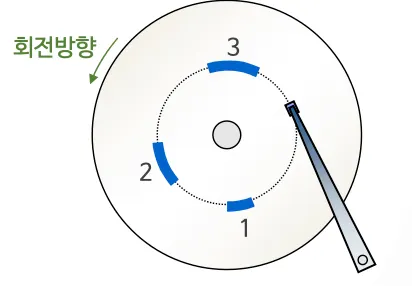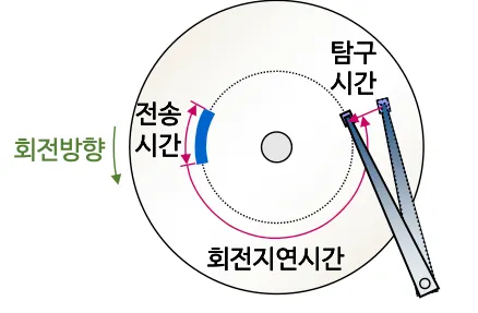 탐구 시간(seek time) + 회전지연시간(rotation latency time) + 전송 시간