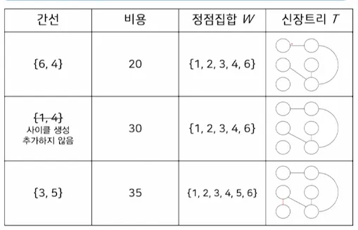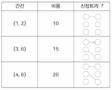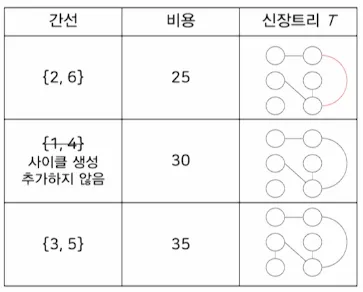 이 간선을 최소 비용 신장 트리 T에 추가하였을 때 사이클을 형성하지 않으면 T에 추가하고 아니면 무시함