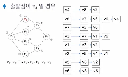 출발점 v를 방문하는 것으로 시작함