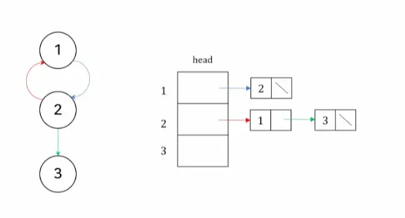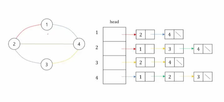 각 리스트 들은 헤드 노드를 가지며,헤드 노드들은 자신의 인접 정점을 순차적으로 가리키고 있음