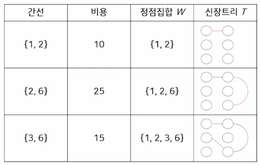 단계가 거듭되면서 숲 내의 트리들이 최소 비용을 갖는 간선으로 연결