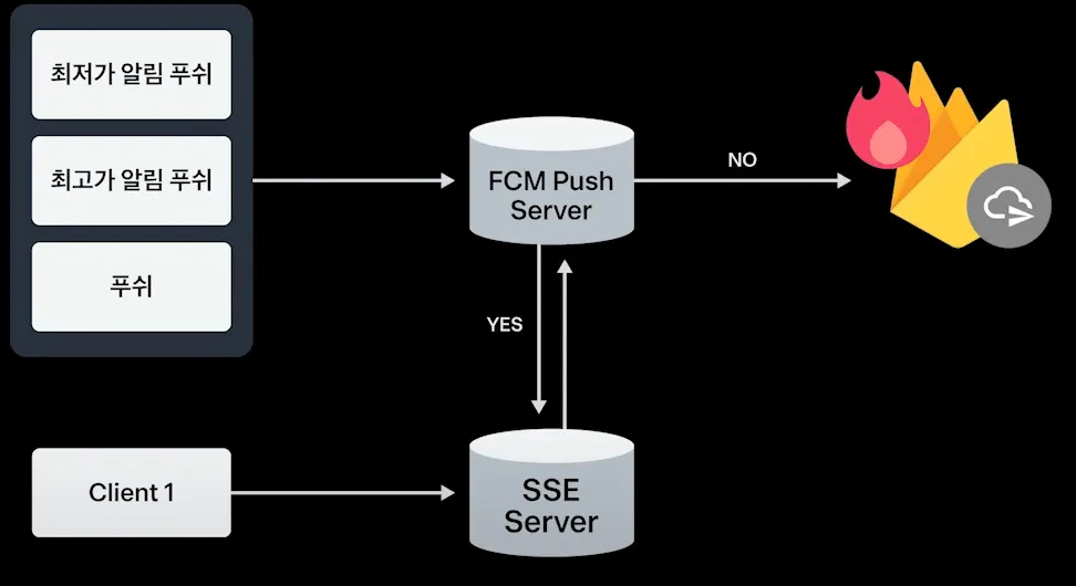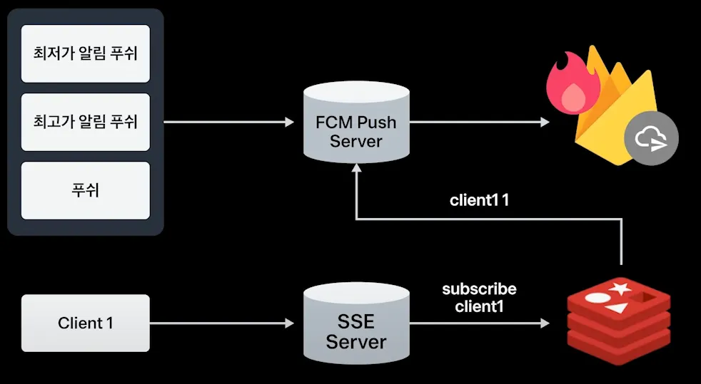 SSE 서버에서의 구독(Subscribe): 사용자가 SSE 서버에 연결하면, 해당 SSE 서버는 Redis PubSub을 통해 특정 유저를 지칭하는 토픽(e.g., client1)을 구독합니다. Redis PubSub의 구독 정보는 Redis 서버에 저장되므로, 현재 구독 중인 유저가 접속 중이라는 정보를 파악할 수 있습니다.