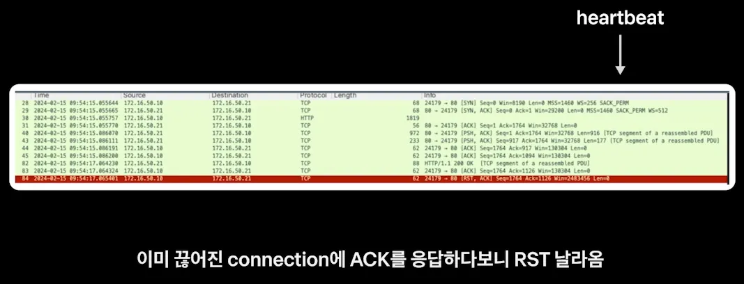 이 과정이 반복되면서 프록시는 끊어진 연결을 제대로 정리하지 않고 계속 Heartbeat 패킷을 서버로 보내려고 하기 때문에, 서버에서 RST 패킷이 계속 발생함