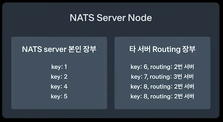 NATS 서버 노드 내부에는 본인이 라우팅할 장부, 타서버로 라우팅할 장부 2가지가 존재