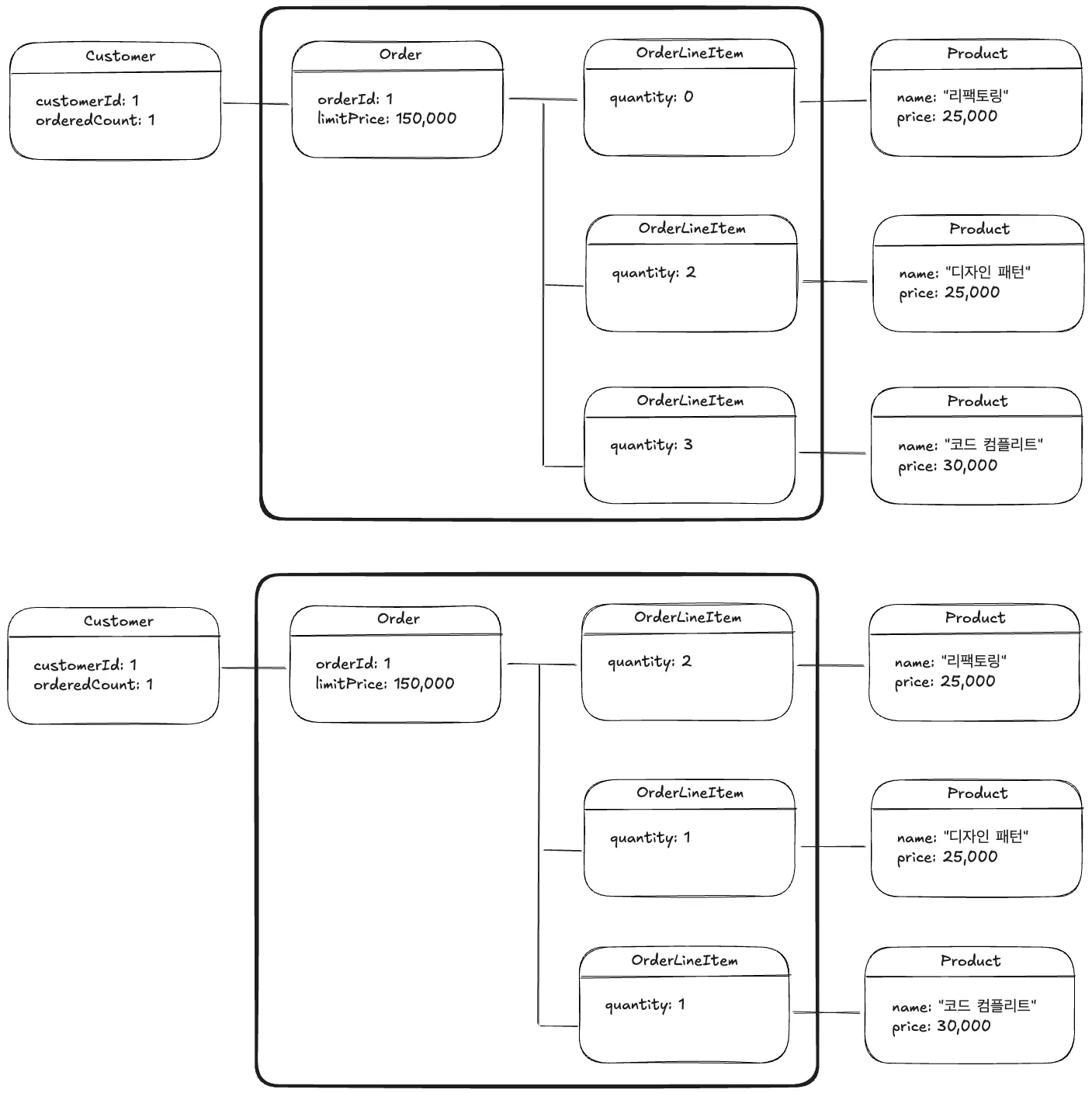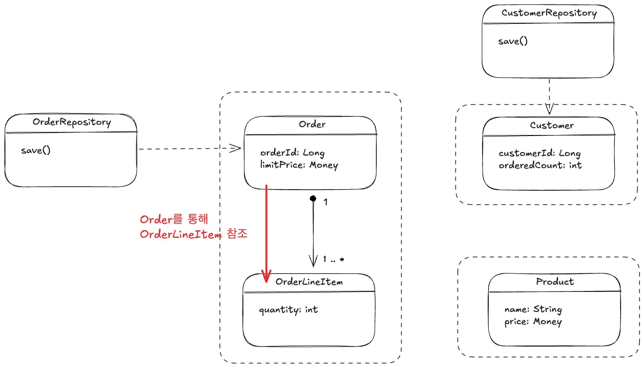AGGREGATE의 경계 밖에서는 루트 ENTITY를 제외한 AGGREGATE 내부 구성요소를 참조할 수 없다.