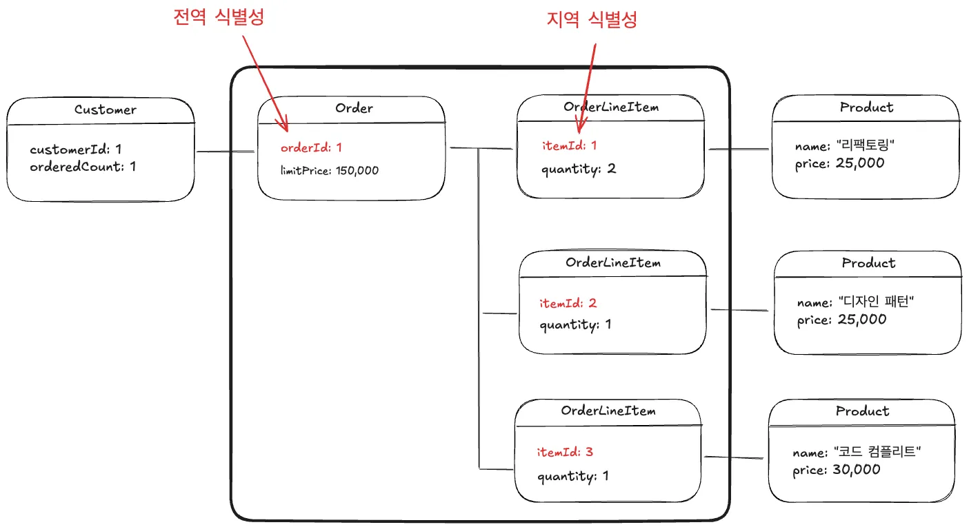 애그리거트 루트에 의해서만 접근하므로 내부에서만 구분 가능한 식별자 (하위 도메인의 식별자)
