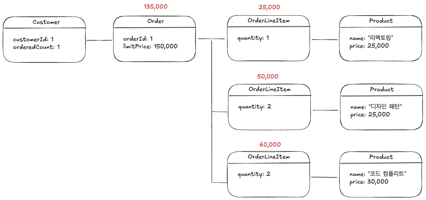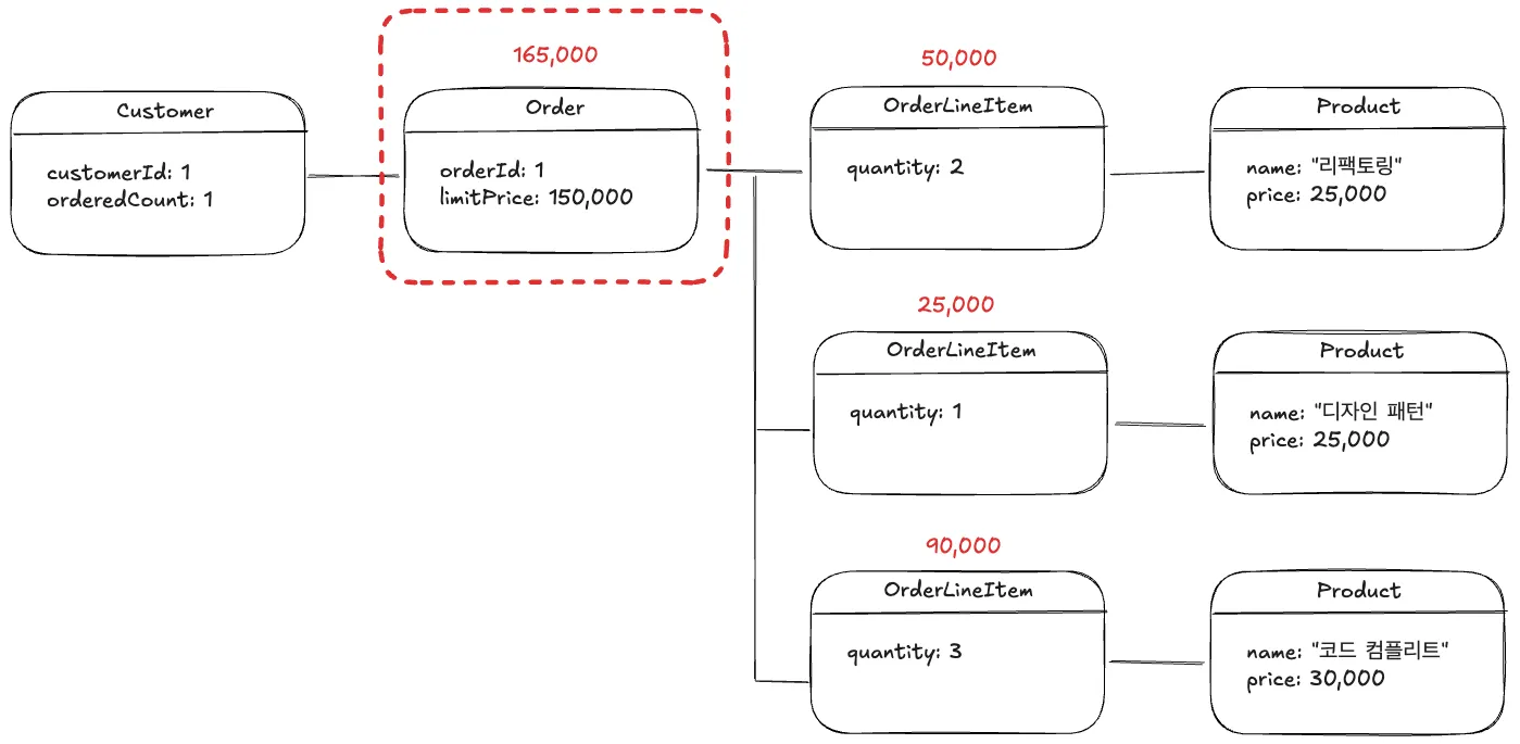 OrderLineItem의 총 금액의 합 (165,000)이 Order의 limitPrice (150,000) 보다 같거나 작음