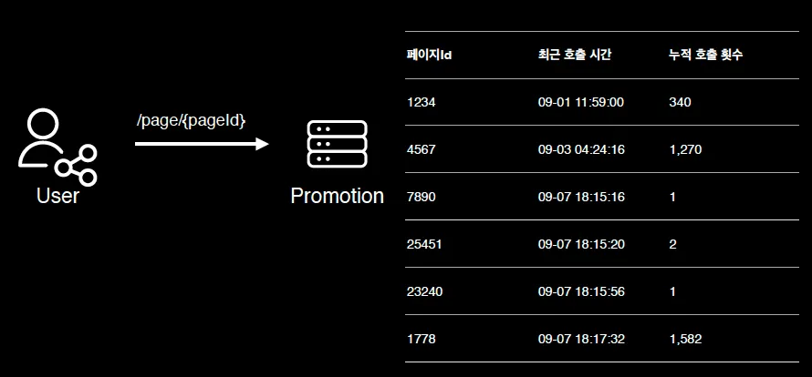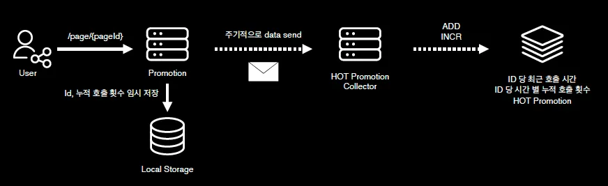 사용자 요청이 들어올 경우, 프로모션 서버 각 인스턴스 로컬 스토리지에 id, 누적 호출 횟수 임시 저장
