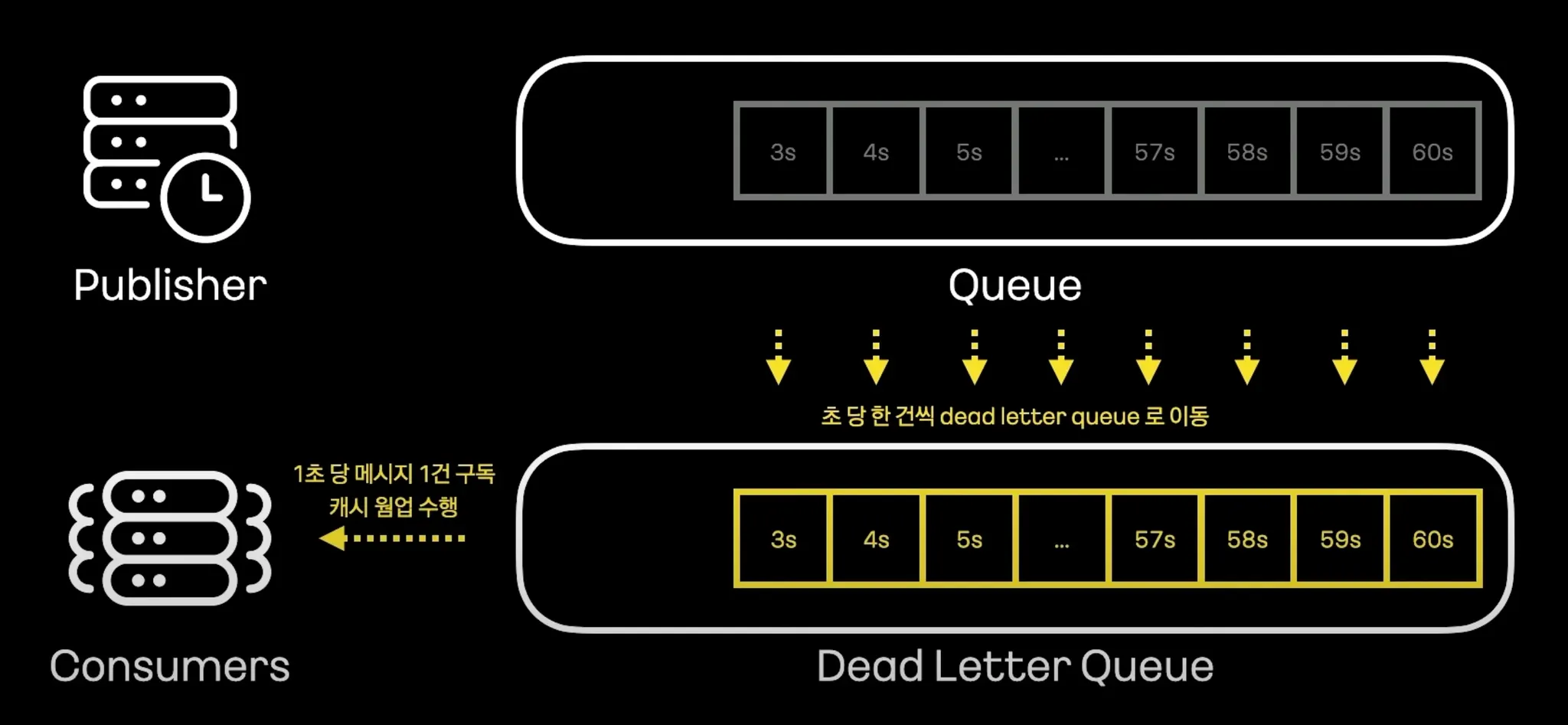 첫번째 메세지 (TTL = 1s)가 1초 뒤 DLQ로 이동 → 메세지 구독 → 캐시 웜업 수행