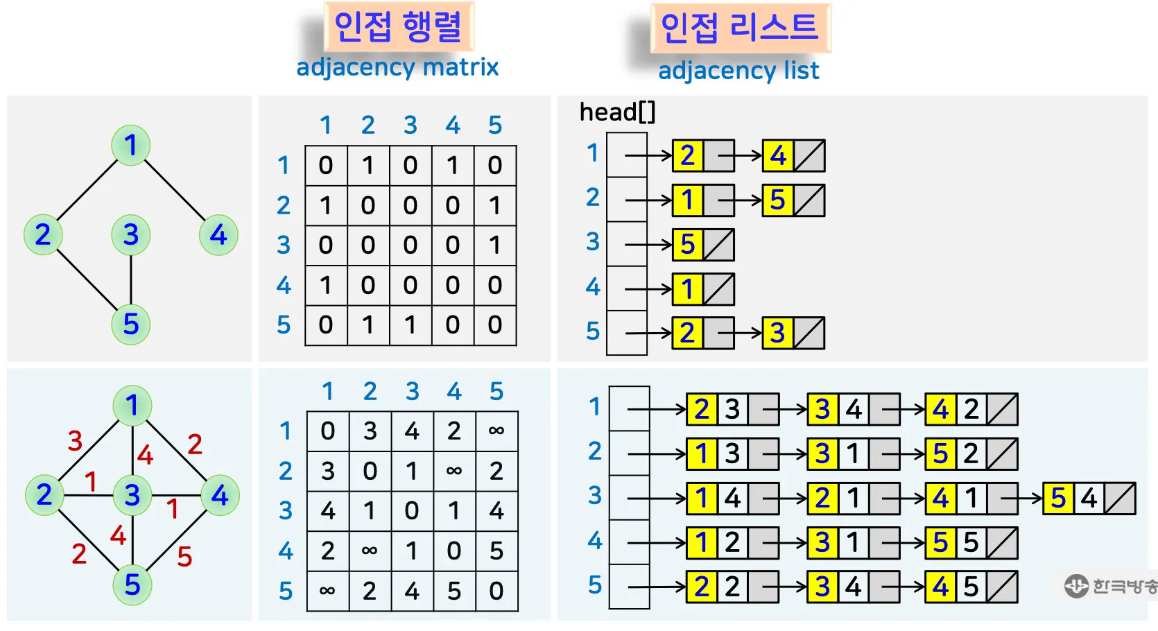 정점 수 의 제곱 크기 행렬로 표현 |V| * |V|