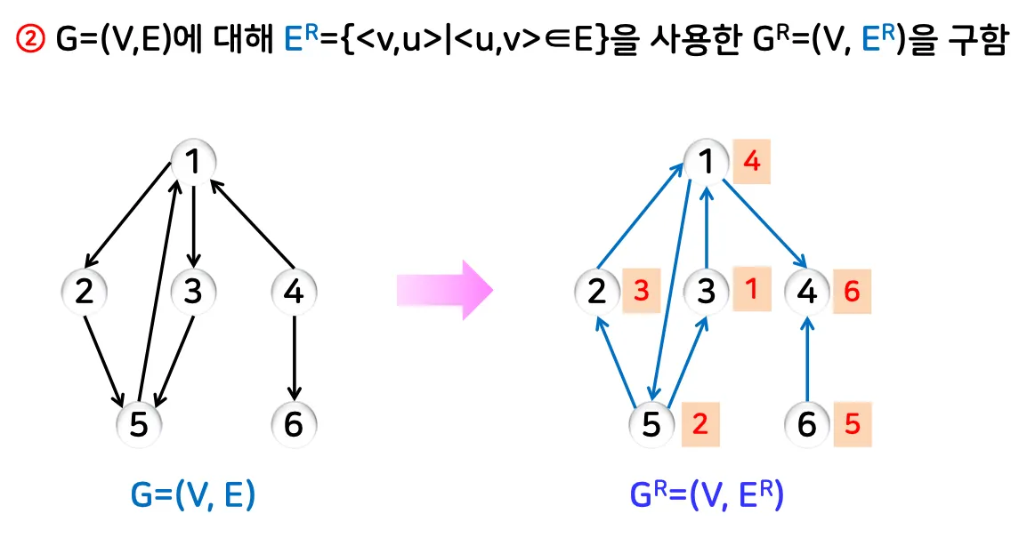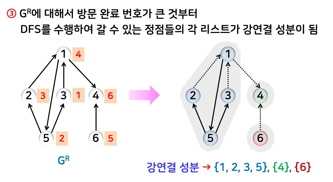 간선의 방향을 뒤집은 그래프에서, 방문 완료 순서의 역순으로 DFS 수행.
