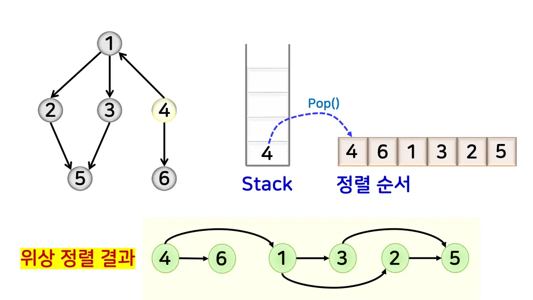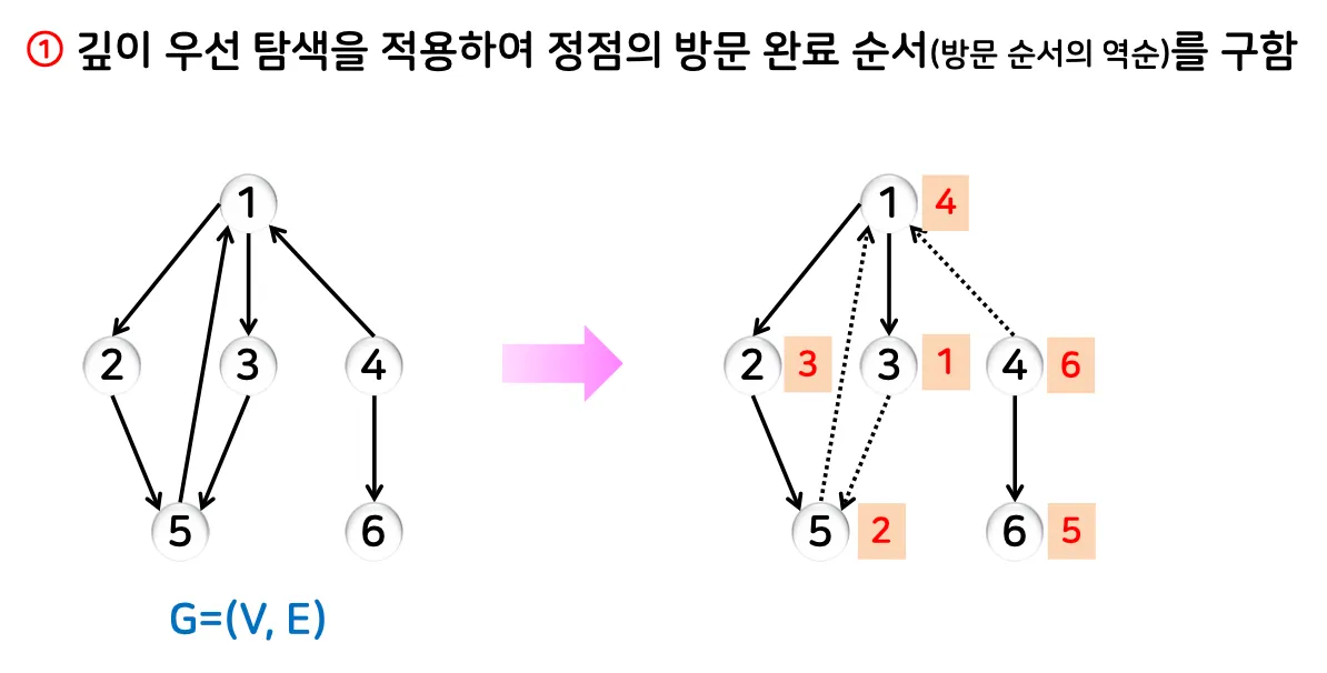DFS를 수행하여 각 정점의 방문 완료 순서(방문 순서의 역순) 기록