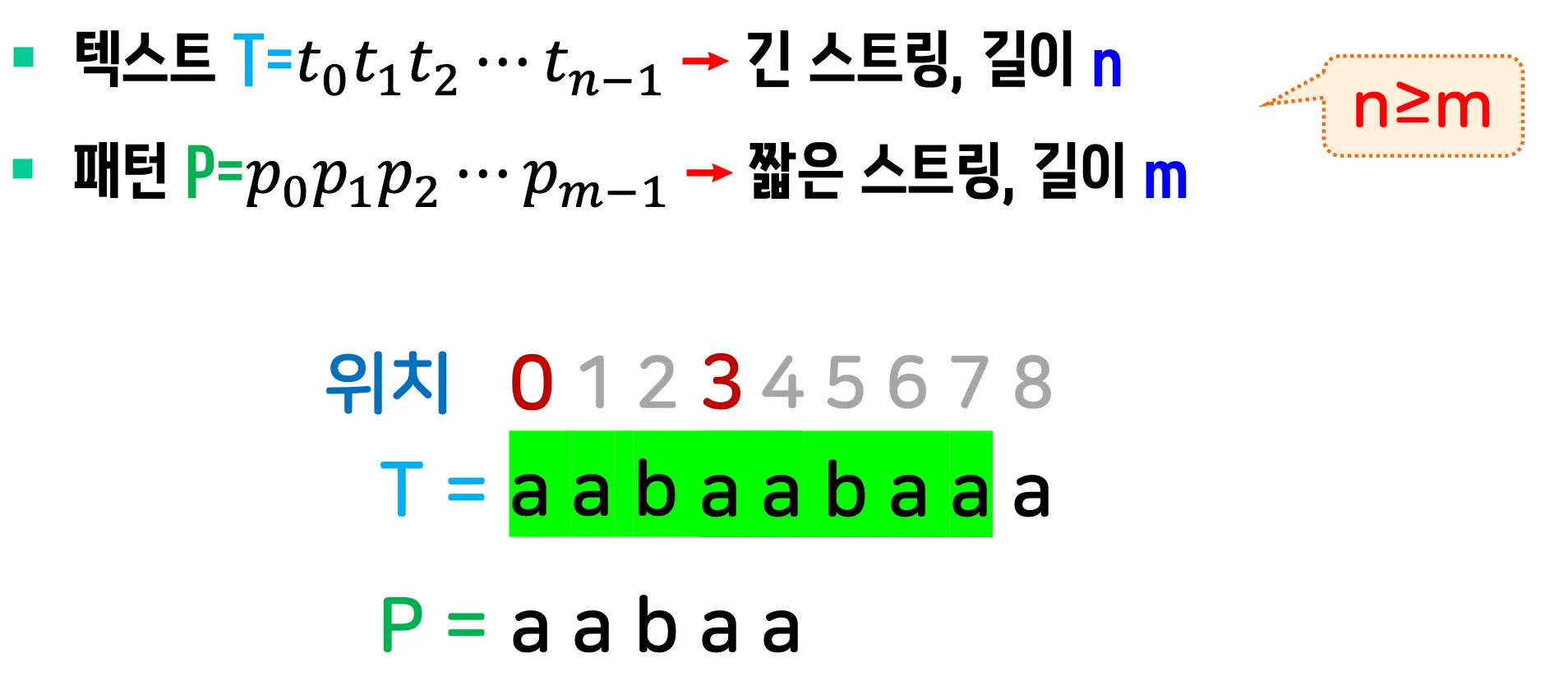 for (i = 0; i <= n - m; i++) { // 텍스트의 가능한 모든 위치에서 O(n)