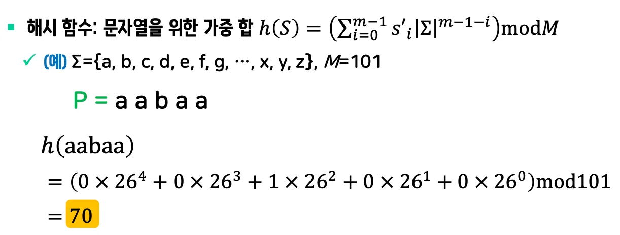 텍스트의 각 위치마다 해시값 계산이 필요하지만, 직전 위치의 해시값을 이용하여 상수 시간에 계산 가능