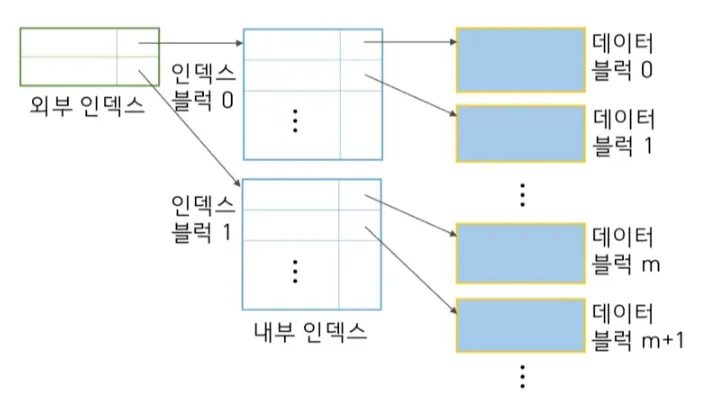 내부 인덱스는 백만개의 블럭을 갖는 반면, 외부 인덱스는 100개의 블럭만 사용하여 작은 크기의 외부 인덱스로 메모리 적재 가능