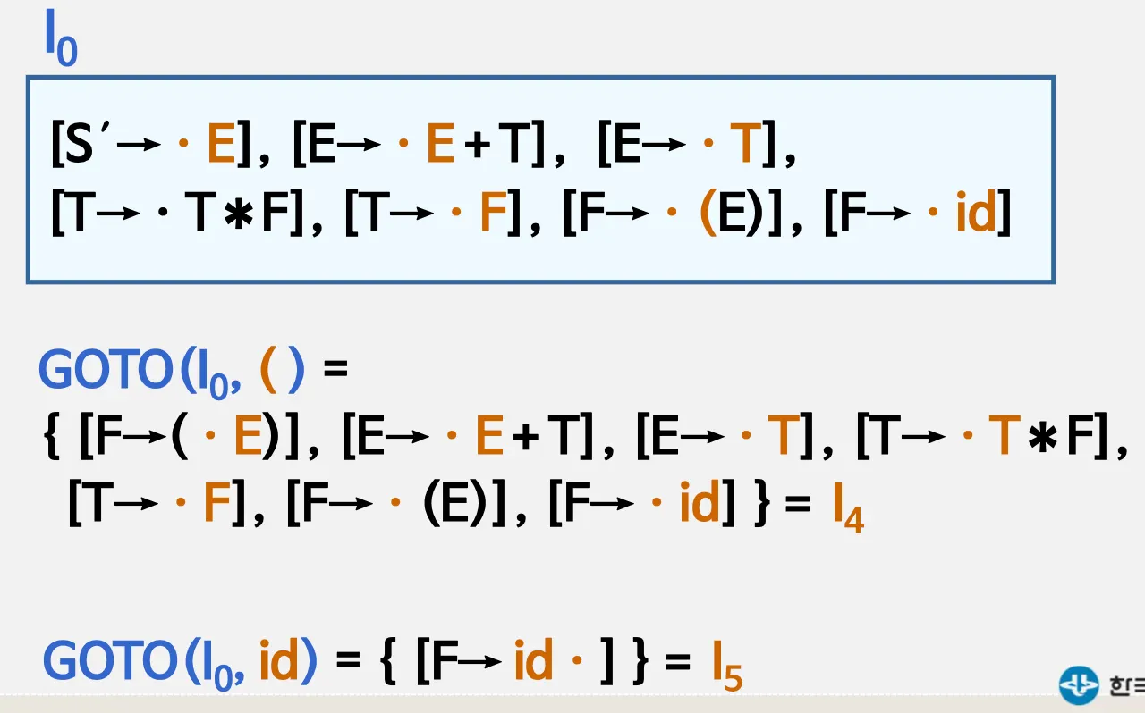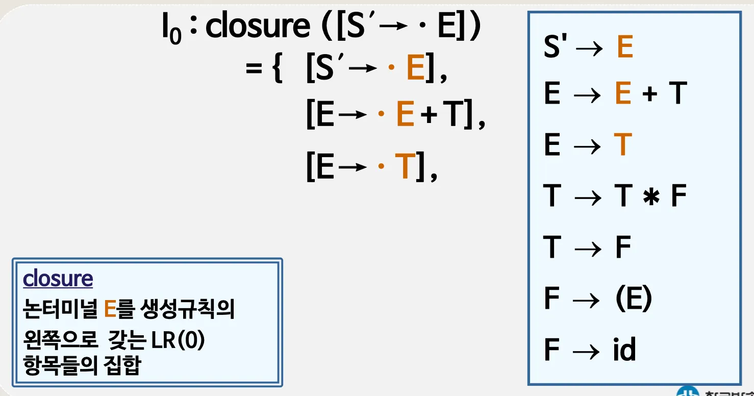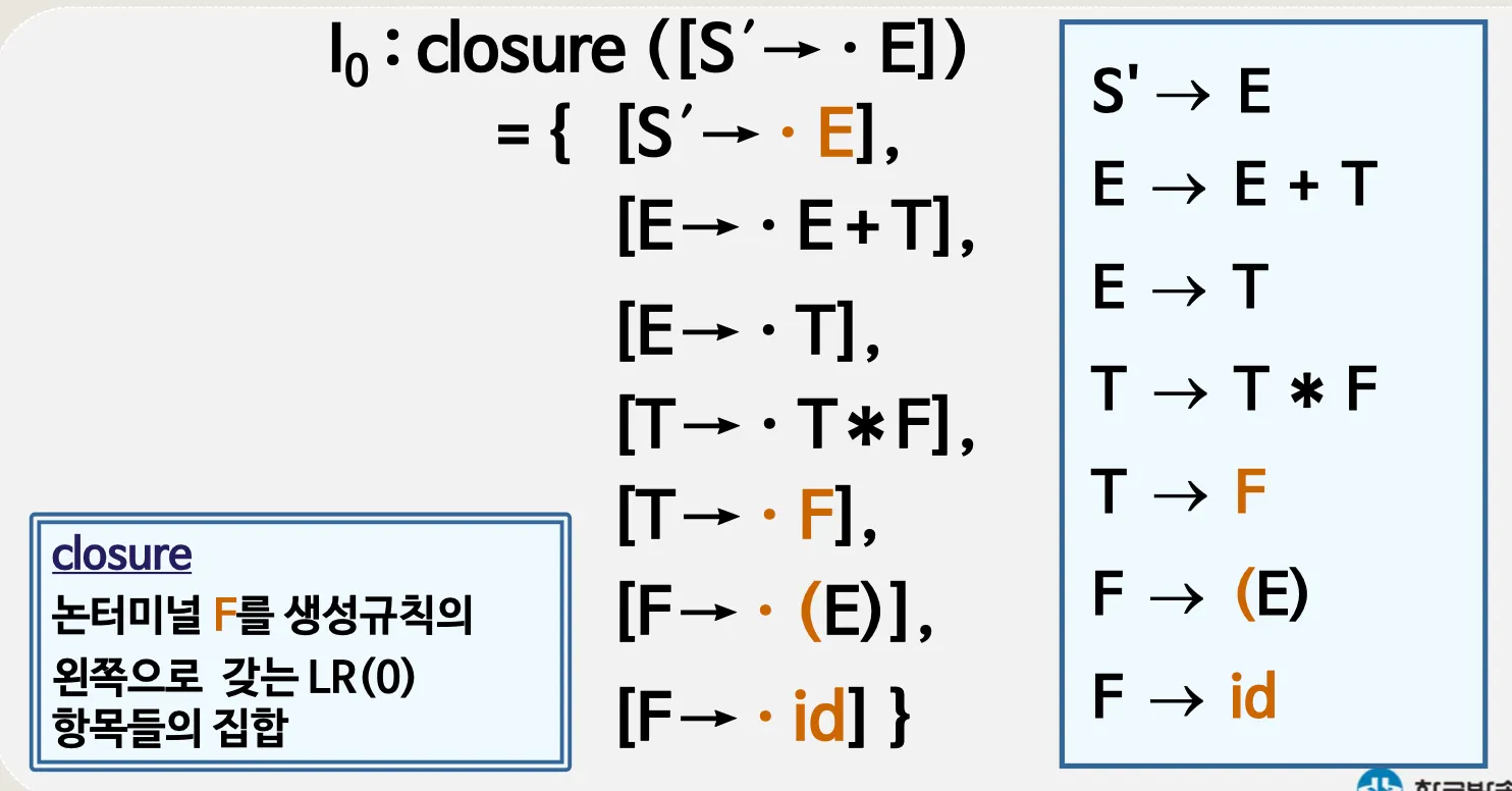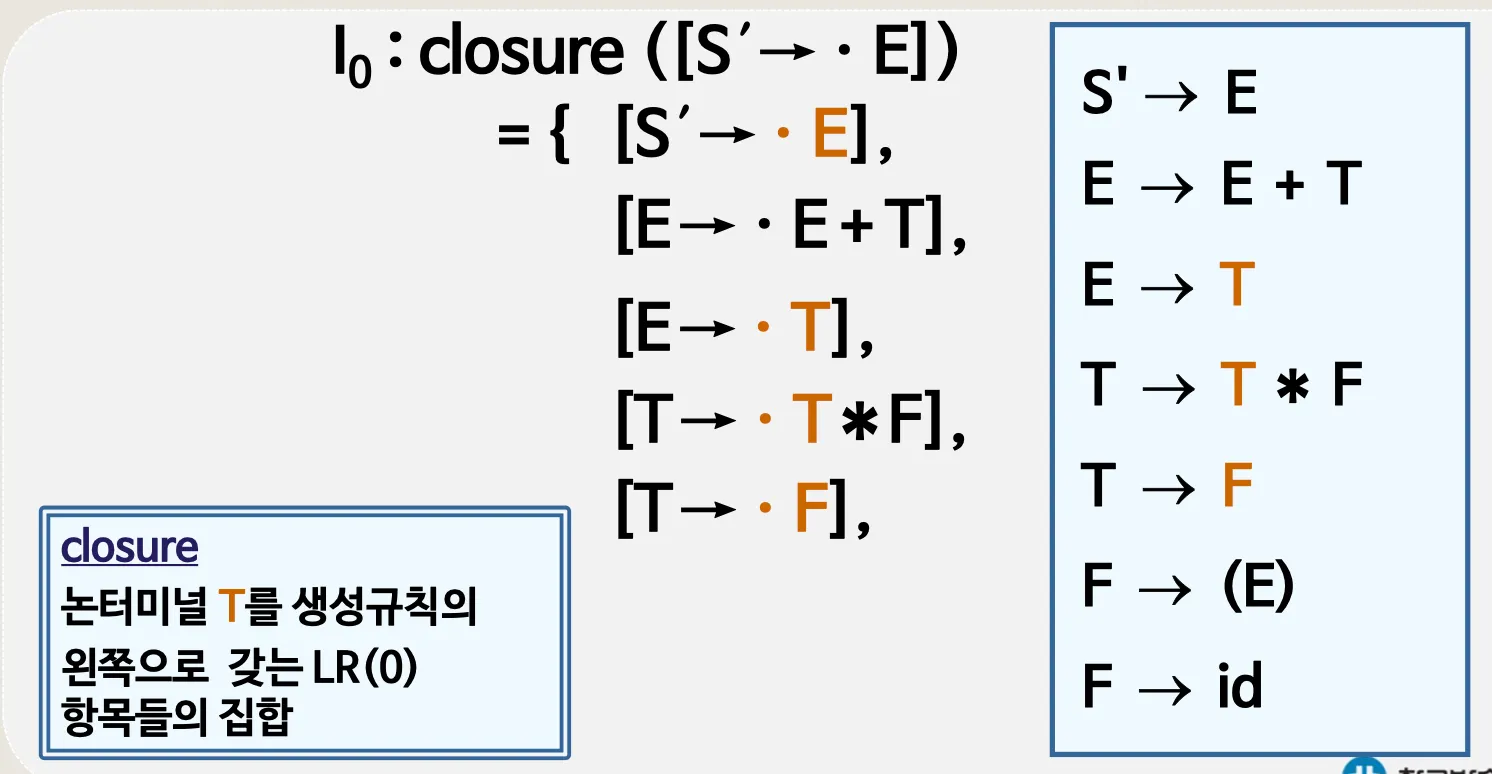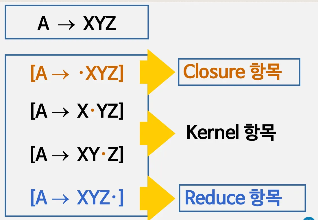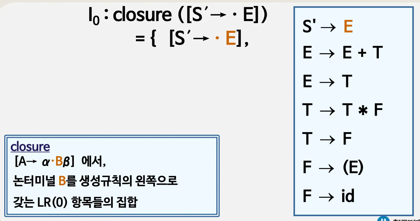 [A→ α·Bβ] 에서, 논터미널 B를 생성규칙의 왼쪽으로 갖는 LR(0) 항목들의 집합