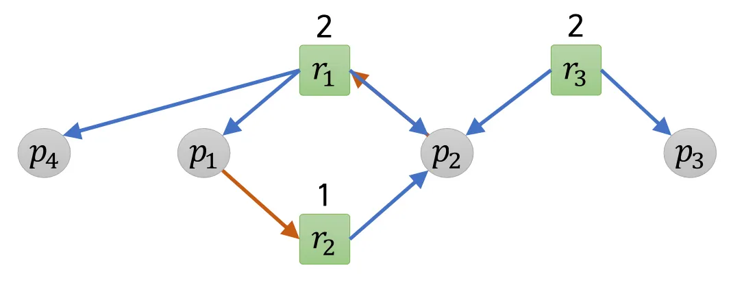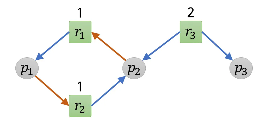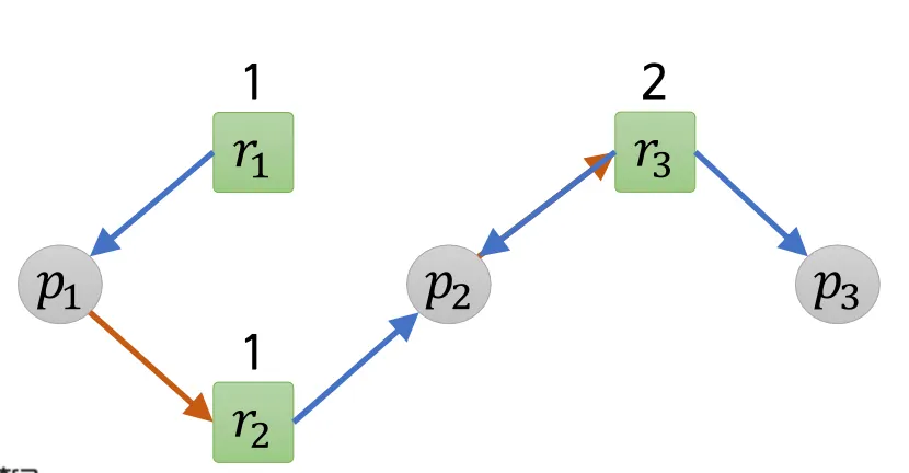 가용한 단위자원 존재하면 할당간선 (r3, p2)로 바꿈