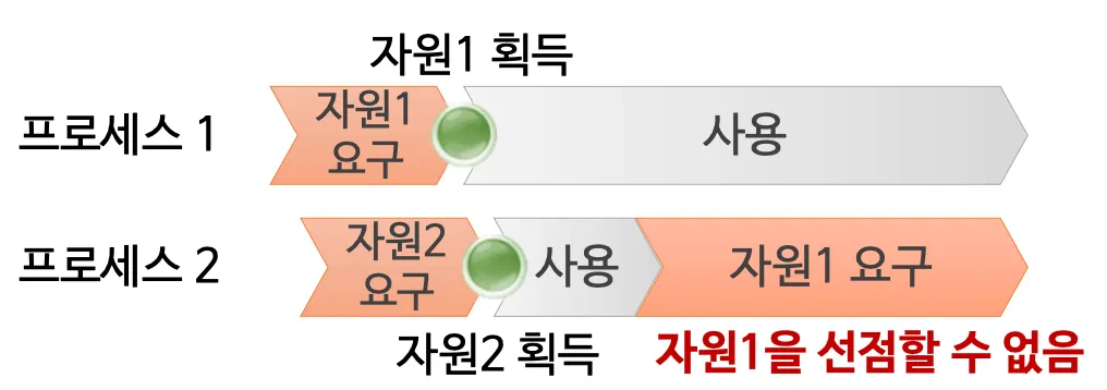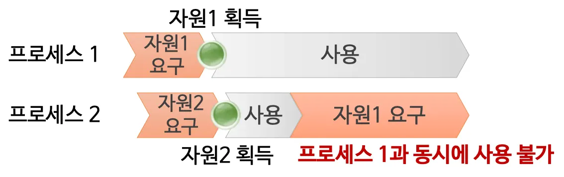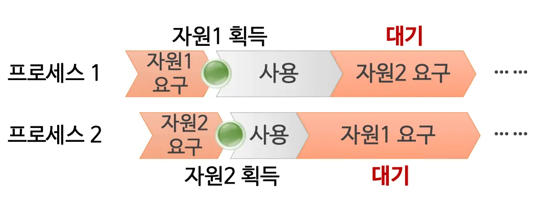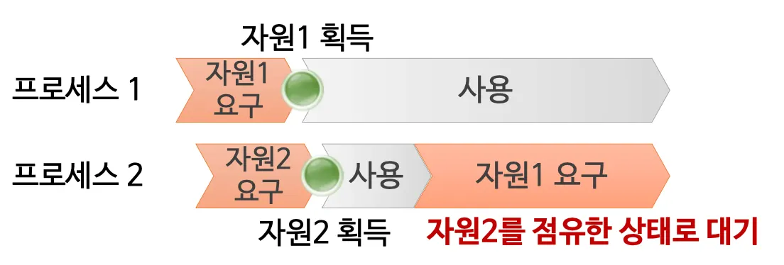 프로세스가 이미 한 자원을 할당받아 점유하고 있는 상황에서 다른 프로세스가 점유하고 있는 또 다른 자원을 요구하여 해제되기를 기다리는 상황