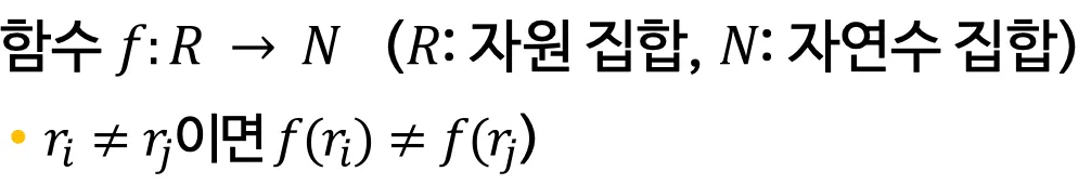 가장 최근에 할당받은 자원이 Ri이면 다음에 요구할 자원 Rj는 f(Ri) < f(Rj) 만족