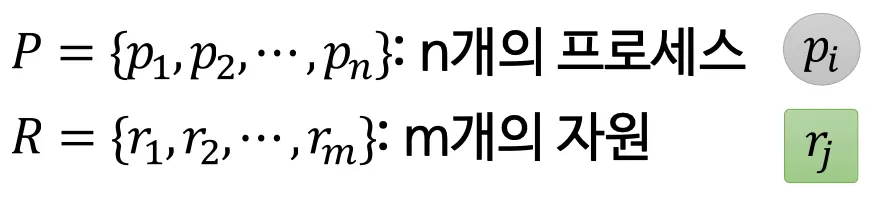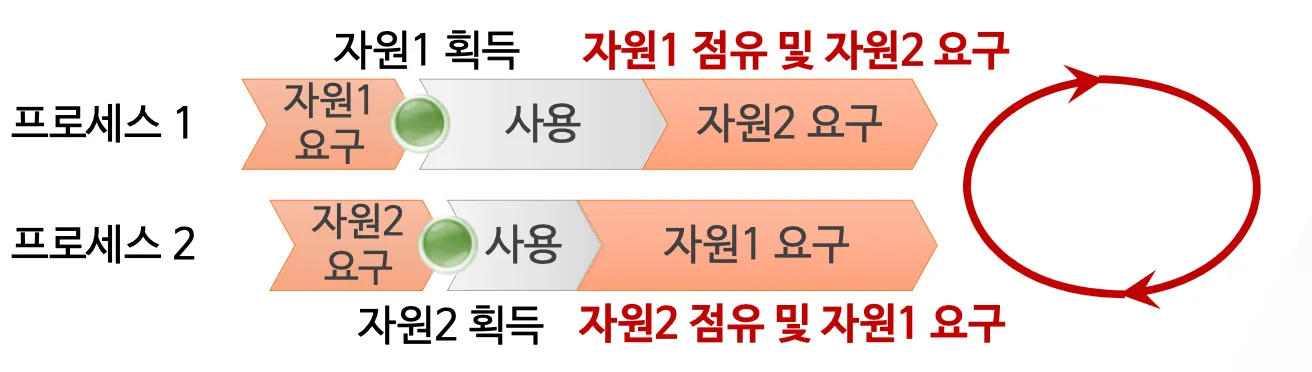 프로세스의 자원 점유 및 점유된 자원의 요구 관계가 환형을 이루며 대기하는 상황