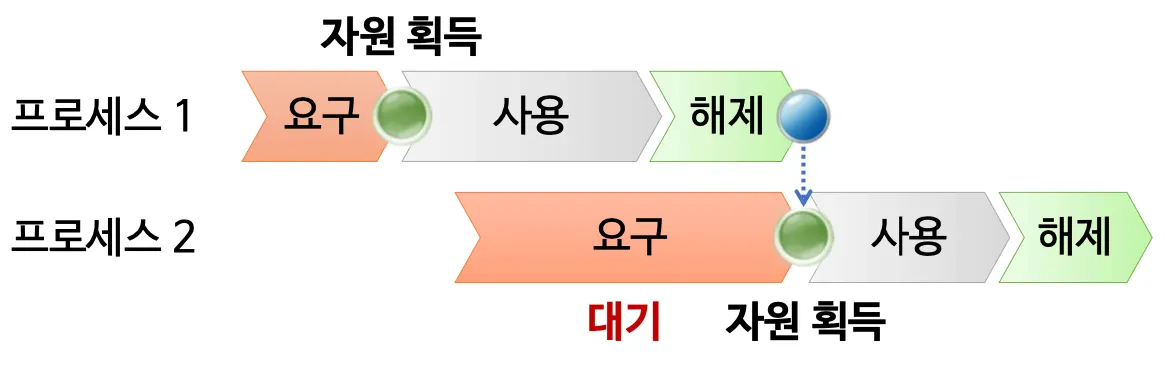 요구과정에서 가용한 자원이 없으면 → 자원을 획득할 때 까지 대기