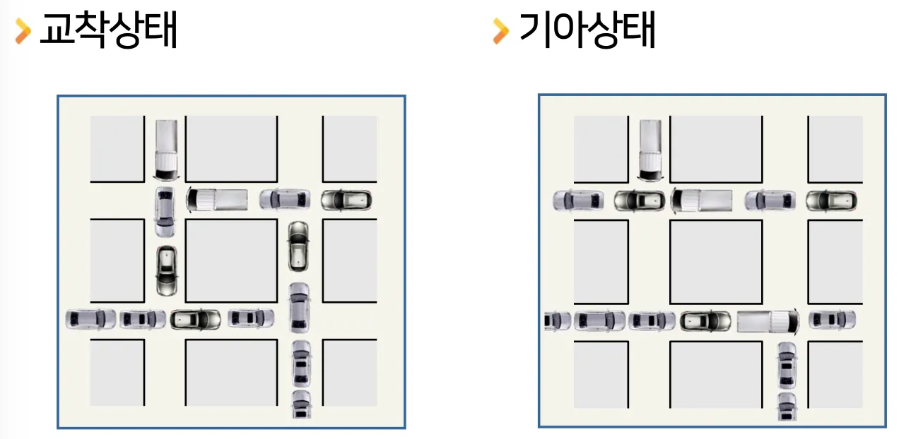 여러개의 프로세스가 서로 상대방의 작업이 끝나기만 기다리고 있어서 어느쪽도 영원히 진행하지 못하는 상태