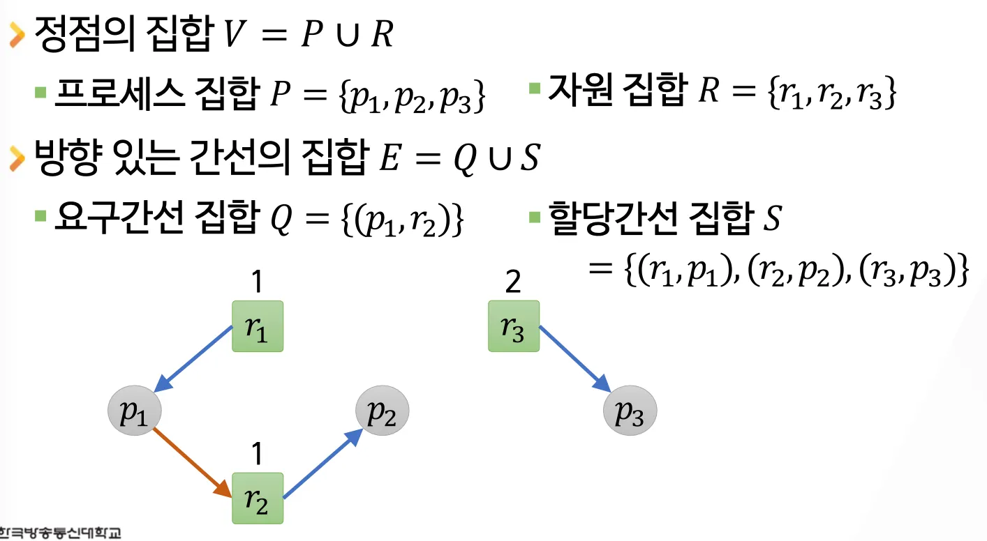 점유대기: 한 프로세스에 할당간선과 요구간선 연결 - p1, p2