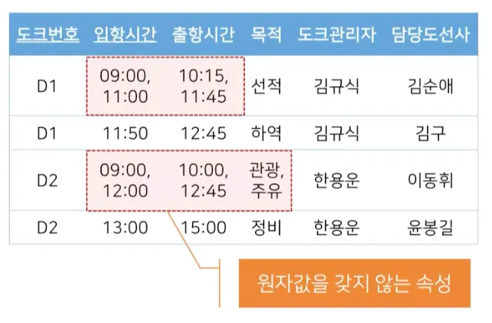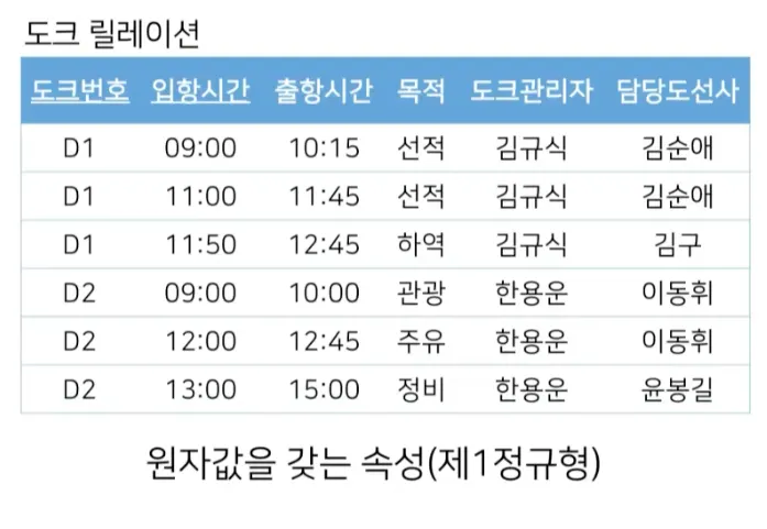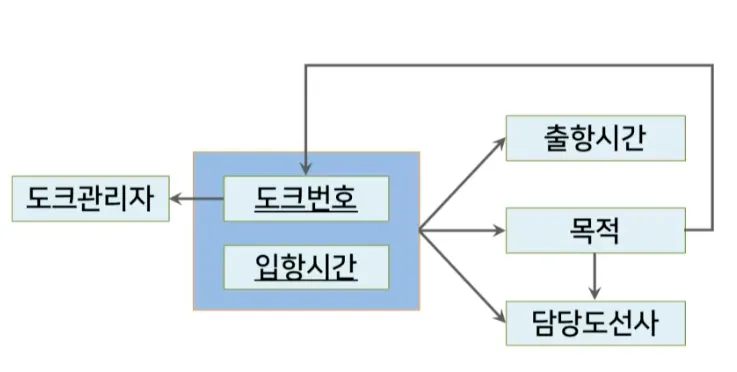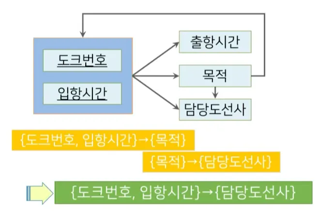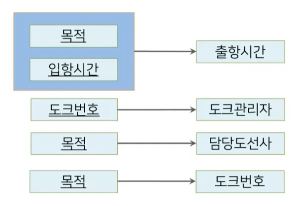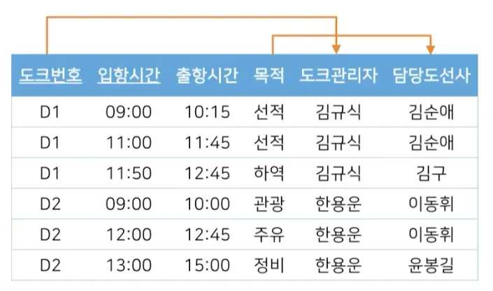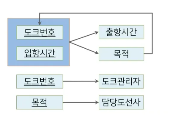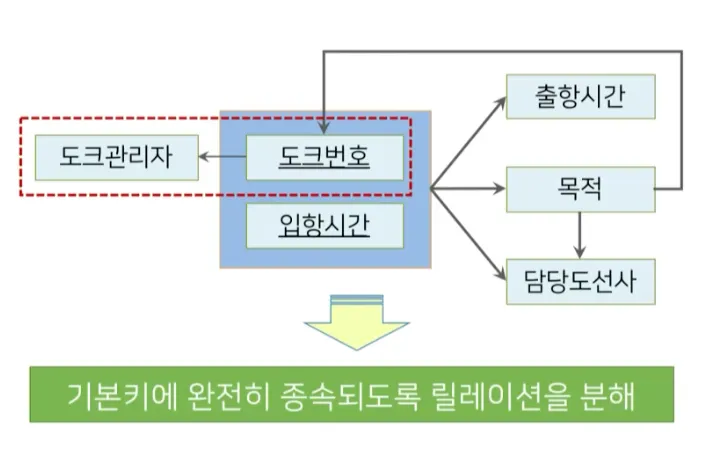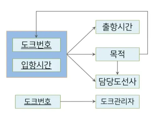 목적은 기본키, 후보키에도 포함되지 않는 일반속성인데도 도크번호라는 속성을 종속하고 있음