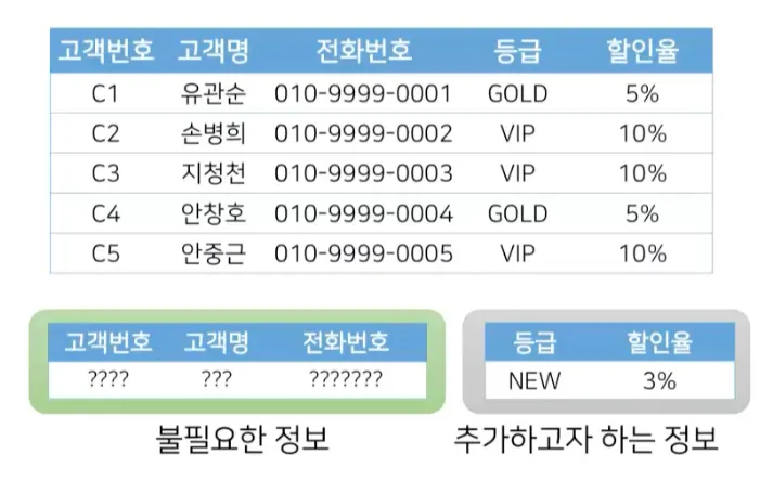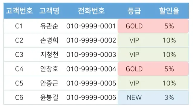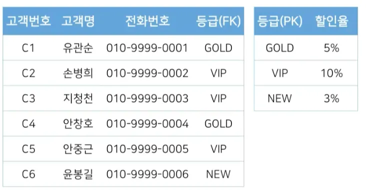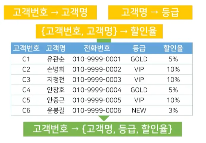 고객번호는 {고객명, 등급, 할인율}를 종속한다.