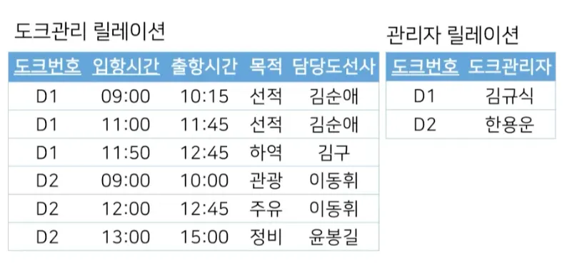 도크 관리 - {도크관리자}, {도크번호, 도크관리자}