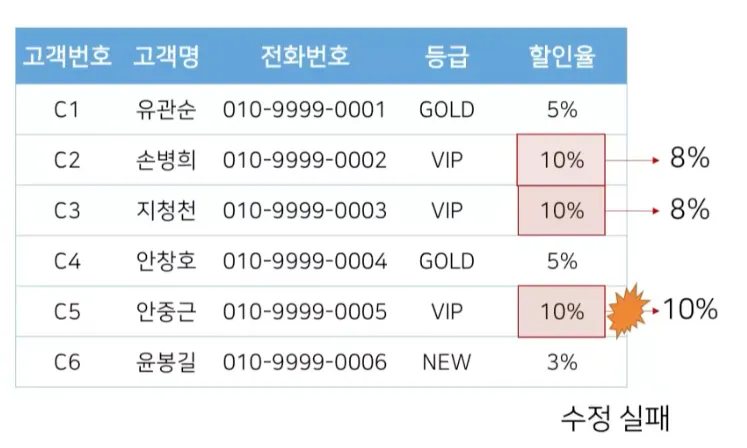 중복 저장된 레코드를 수정 시 모두 반영이 안되어 일관성이 깨지는 경우