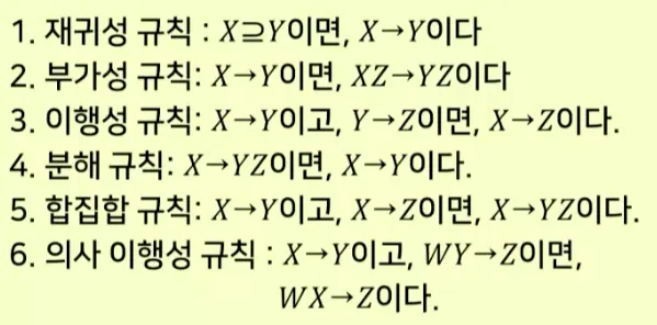 r1[X] = r2[X] 일때, r1[y] = r2[y] 이면 함수적 종속성 X → Y가 성립한다.