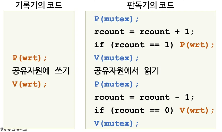 여러 협력 프로세스 사이에 공유자원을 두고 판독기와 기록기의 상황을 다루는 문제