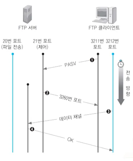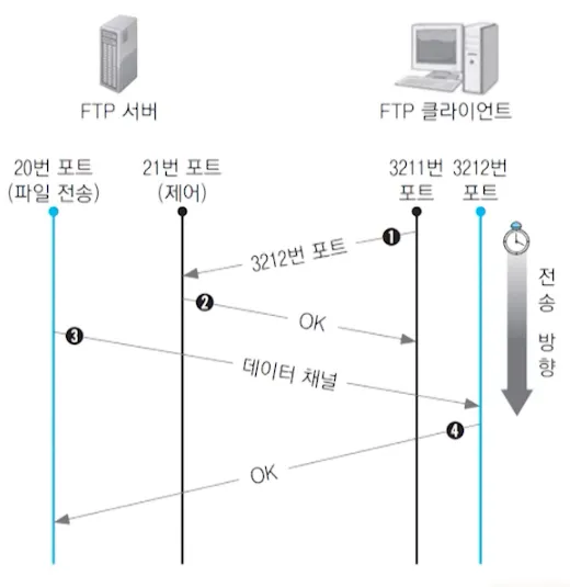 클라이언트는 FTP 서버의 21번 포트 접속 후 사용할 두번째 포트를 서버에 알려줌