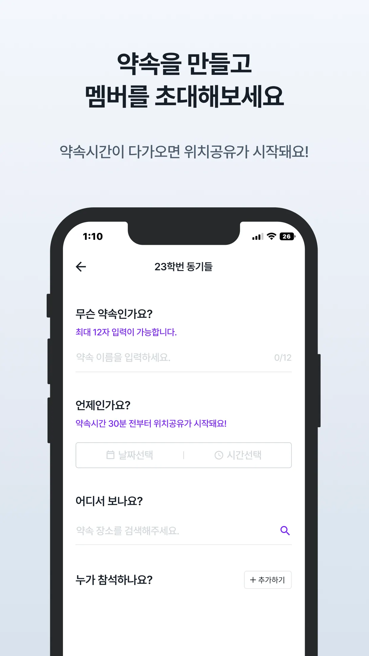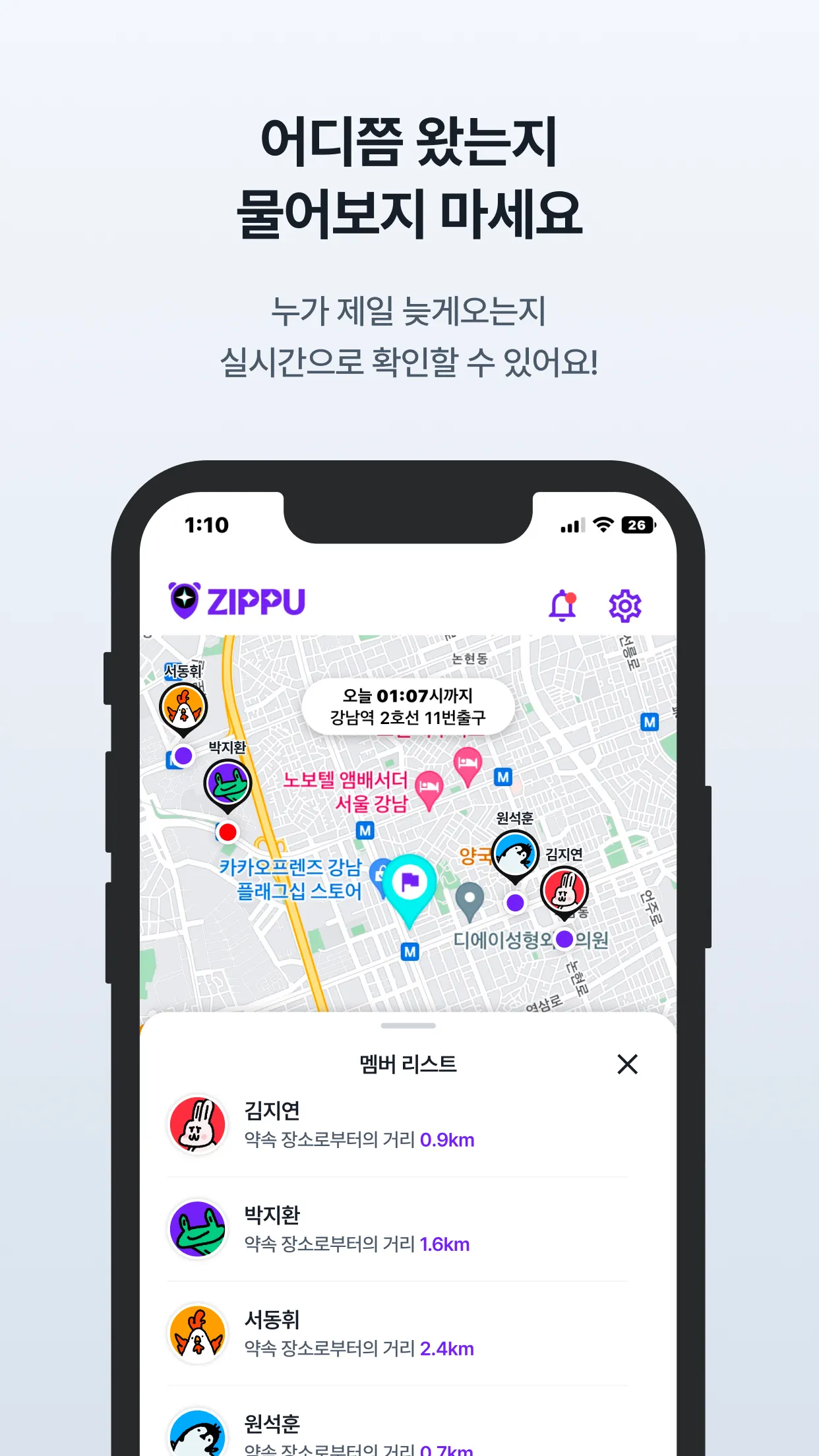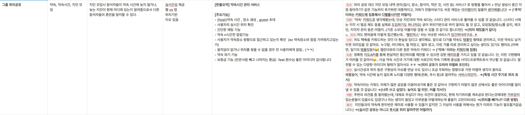 아이템을 선정하는 기준을 설정하는데 있어 다들 많은 의견을 내주셨지만 그중 공통적으로 나온 내용은 재밌고 뾰족한 서비스를 만들면 좋겠다는 것이었다. 어디에서나 흔히 볼 수 있는 서비스가 아니라 우리만의 특색있는 서비스를 만드는게 재밌을 것 같다는데 공감이 되었다. 그 결과 약속 지각 방지를 위한 실시간 위치 공유 서비스가 아이템으로 선정되었다.