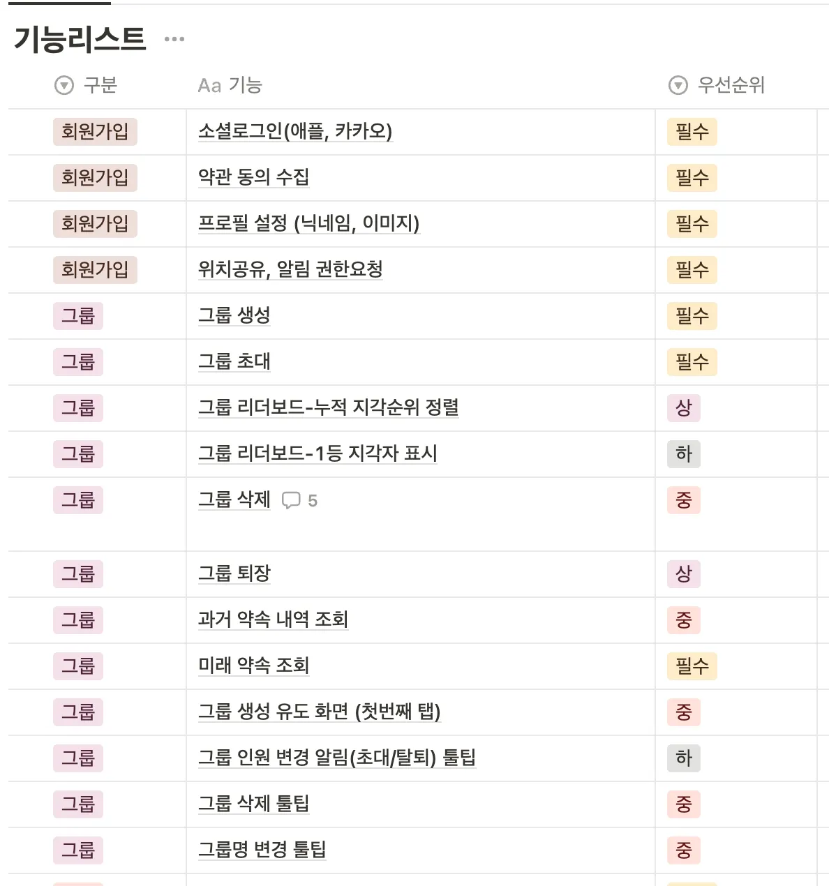 팀 회의시간때, 우리가 정의한 기능들이 MVP에 필요한 스펙이 맞는가? 에 대해 지속적으로 말씀을 드렸다. 특히 사이드 프로젝트 MVP 치고는 UI 및 페이지의 수가 상당히 많았기 때문에 프론트 파트 분들의 업무가 과중될 것이 불보듯 뻔했다. MVP 기능 리스트를 우선순위에 따라 리스트업할 것을 요청 드렸고, 우선순위 중, 우선순위 하 는 과감히 MVP 스펙에서 제외한다고 말씀을 드렸다.