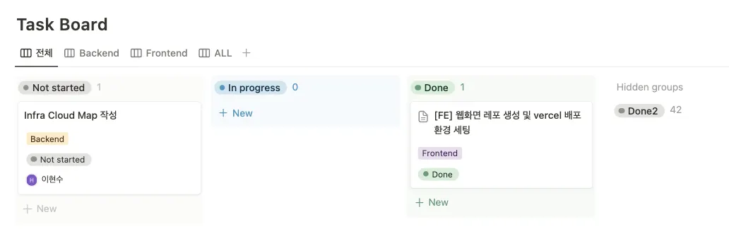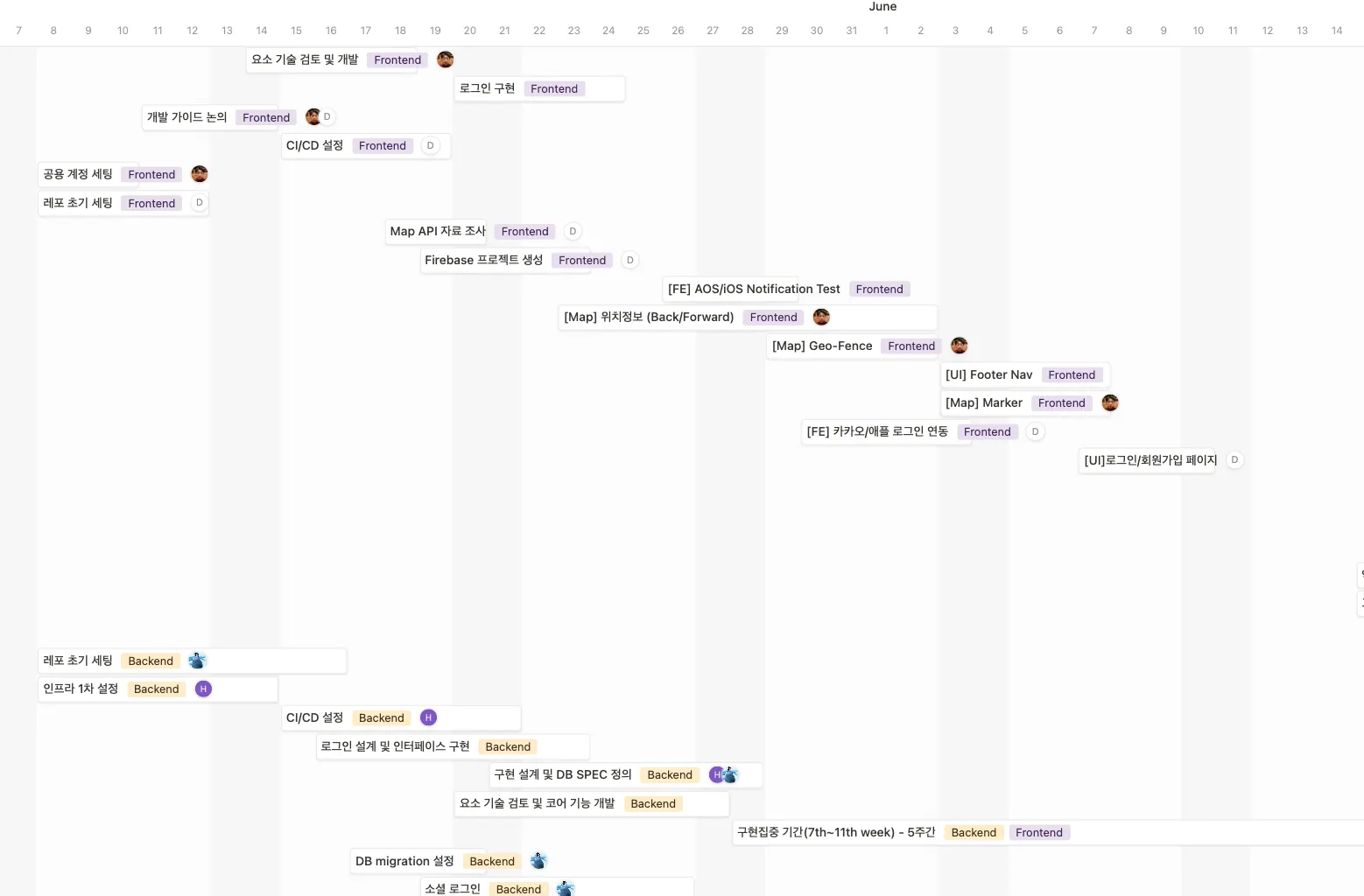프로젝트를 끝나고 나서 돌이켜보면 여기서 아쉬움이 다소 있었다. 노션의 타임라인(간트차트), TODO (칸반보드)가 서로 Align 되어 있지 않아서 작업자의 입장에서는 태스크를 에픽 단위로 관리하기 쉽지 않았다. 그렇다 보니, 프로젝트 중간 중간 칸반보드를 sync 할 것을 요청 드렸지만, 칸반 보드는 사실상 잘 관리가 안되었다. 그리고 나는 백엔드 개발자다 보니, 프론트 개발자분들의 태스크를 관리하기에는 업무적인 한계도 있었다.