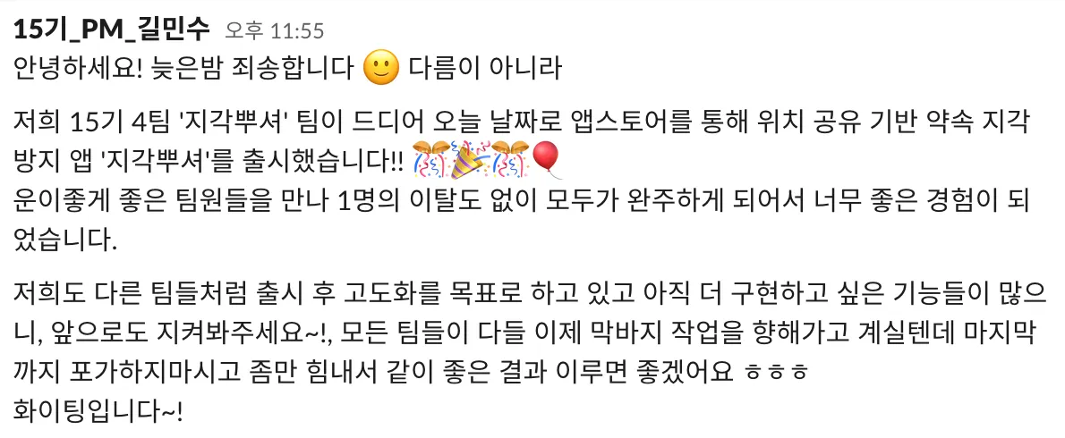 개발 팀장의 역할을 맡다보니 일정에 대한 무언의 압박을 개발파트에 있는 동료분들께 종종 할 수 밖에 없었는데 3분 모두 정말 엄청난 책임감과 열정으로 프로젝트에 임해주시고 잘 따라와주셔서 정말 감사하고 감사하다는 생각이 많이 들었다.