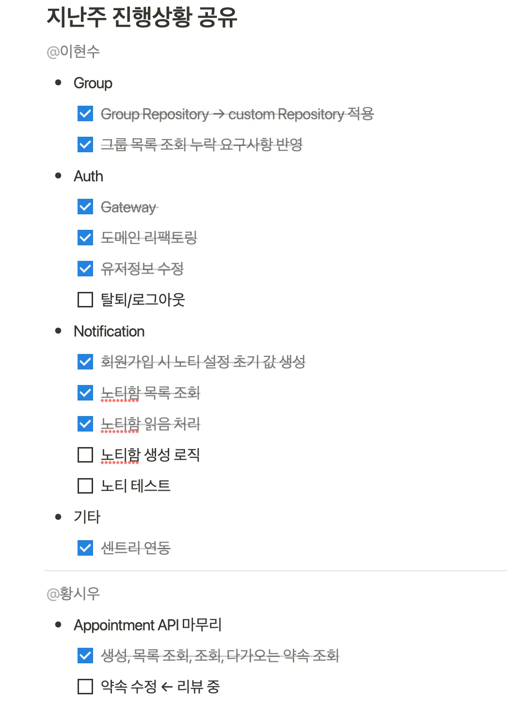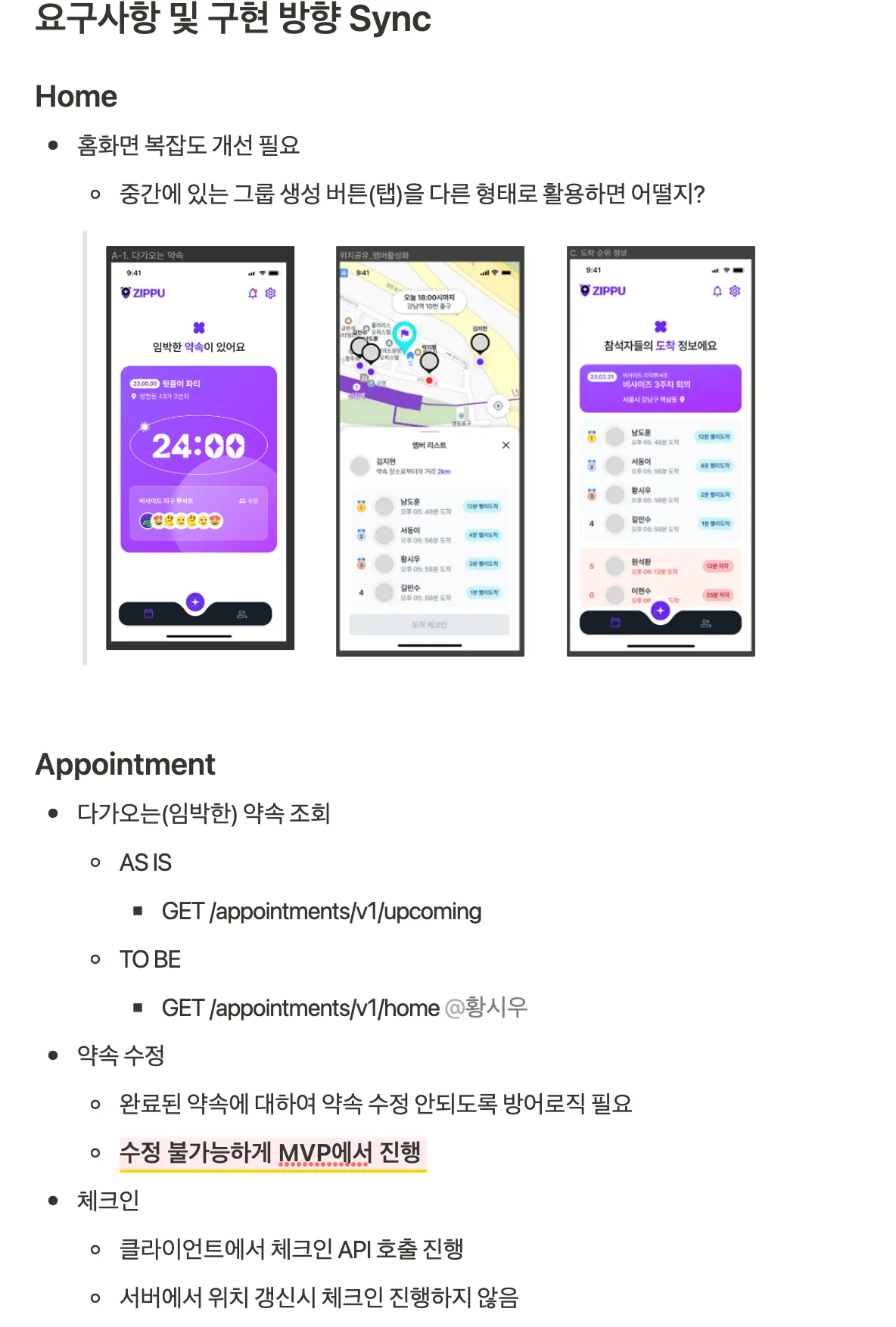 서로 바쁘고 빠르게 개발을 하다보니 개발 방향에 대한 의사결정이 슬랙에서 주로 이루어지는 경우가 있었고, 히스토리를 추적하기가 어려워지고 컨텍스트를 파악에 어려움이 생기는 경우가 많아졌다. 바쁘더라도 중간 중간에 이러한 내용들을 잘 관리하는게 중요하다고 판단되어 주기적으로 백엔드 회의에서 업무 진행상황을 공유하고 요구사항을 Sync 맞추는 작업을 진행하였다.