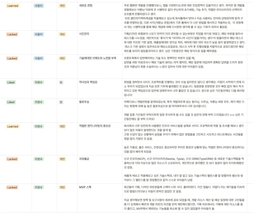 회고 때 특히 공통적으로 나왔던 얘기들이 있었다. 팀원 한분 한분 빠짐없이 모두들 강한 열정과 책임감을 가지고 프로젝트에 임하고 있고, 적극적으로 아이디어를 제공하며 커뮤니케이션을 해줘서 좋았다는 내용이었다. 나 또한 사이드 프로젝트에 대한 안좋은 경험들을 주변에서 많이 들었던 지라.. 다소 많이 걱정도 되었었는데 팀원분들이 정말 다들 열심히 해주셔서 많이 공감되었다.