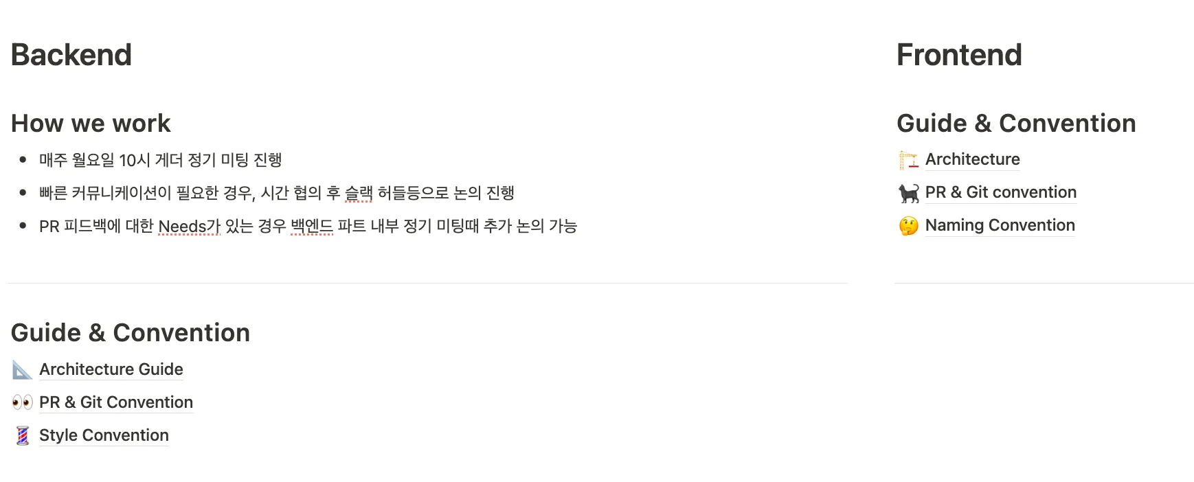 그외 개발 파트에서 정의한 컨벤션이나 논의사항들을 최대한 쉽게 관리가능한 형태를 유지하고자 노션에 문서화를 신경쓰고자 했다.