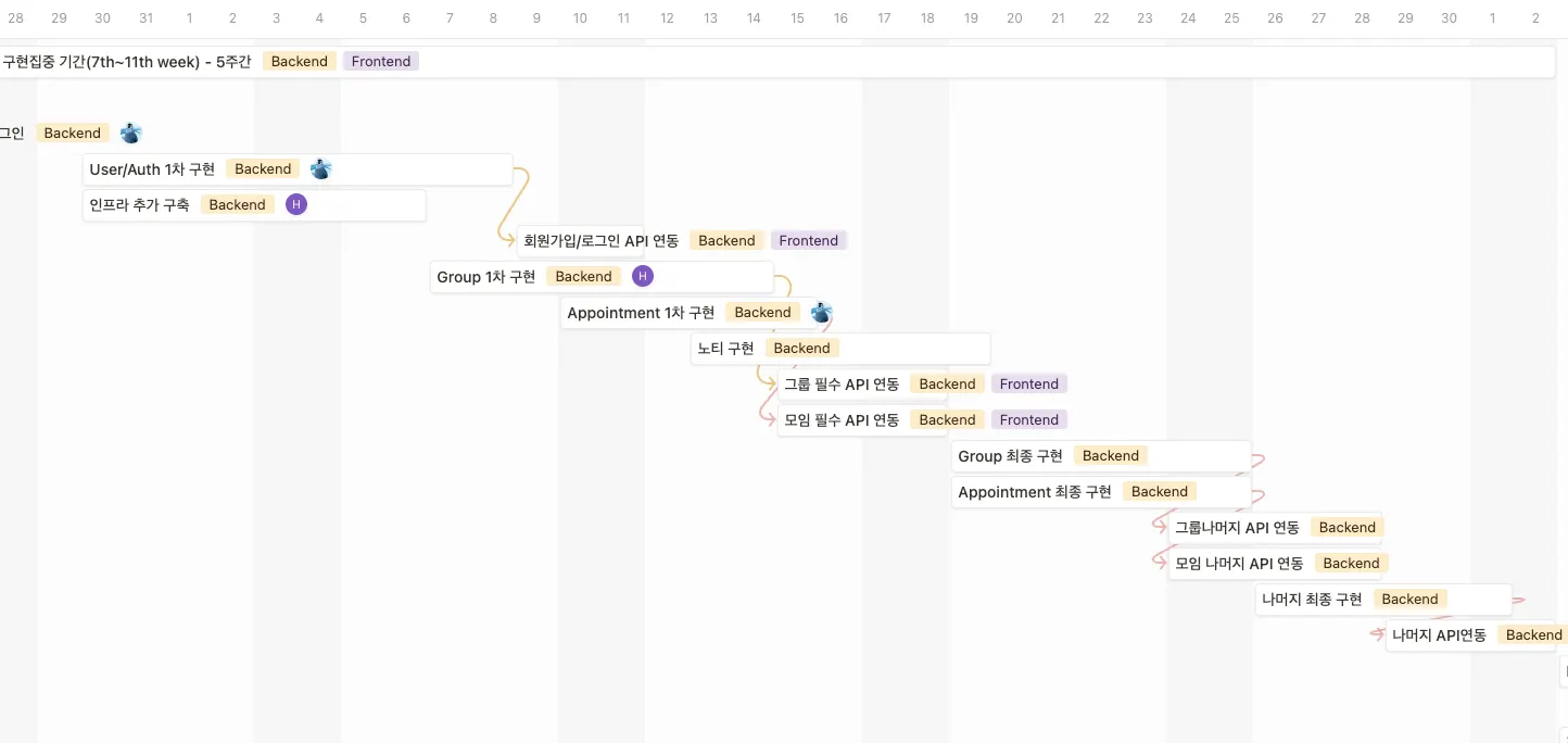 본격적인 개발 집중 기간을 7주차 ~ 11주차 (5주간)으로 잡았었는데, 백엔드 파트의 목표는 5주 내에 모든 API 개발을 완료하는 것이었다. 물론 일정을 조금 더 여유롭게 갖고 갈 수도 있었겠지만 14주차에 앱 출시를 위한 목표를 세운 만큼 못해도 11주차까지는 API 구현이 완료되어야 이후 남은 작업들 (API Integration, QA, 프로덕션 인프라 설정)들을 조금 여유롭게 갖고갈 수 있을거라 판단했다. 뿐만 아니라 혹시 모를 추가적인 이슈 대응을 위한 버퍼 기간을 두고 싶은 욕심도 있었다.